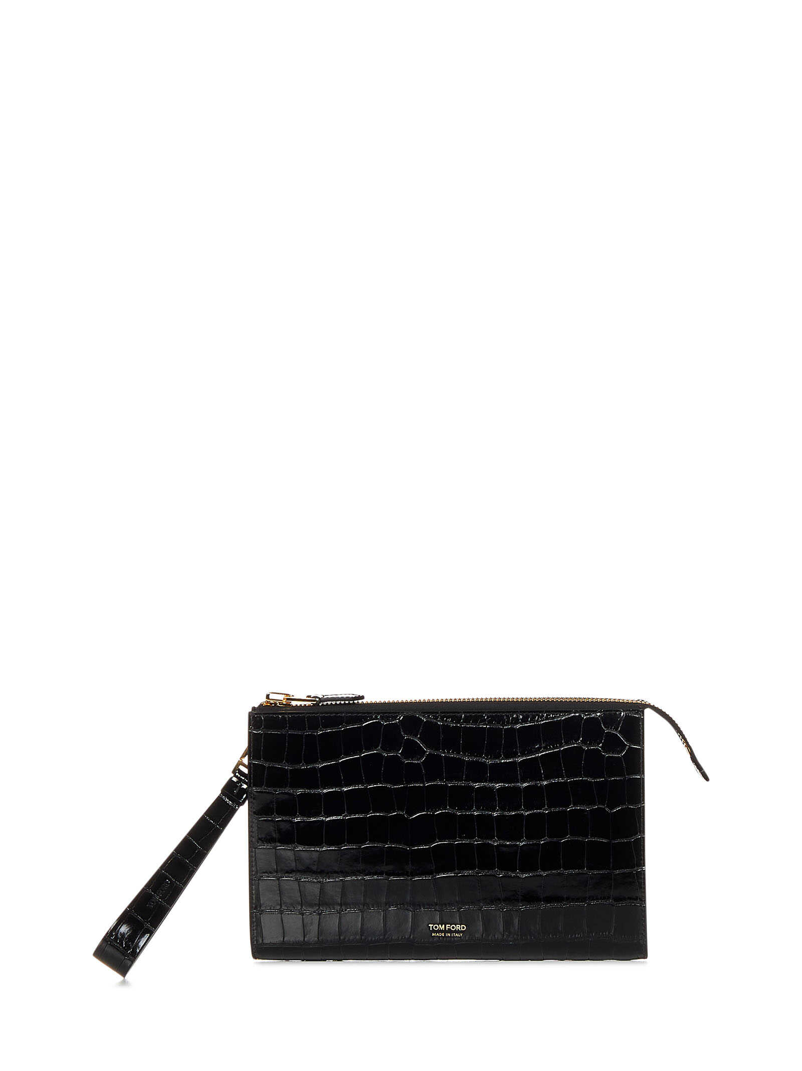 Black crocodile-print calf leather clutch with wrist strap.