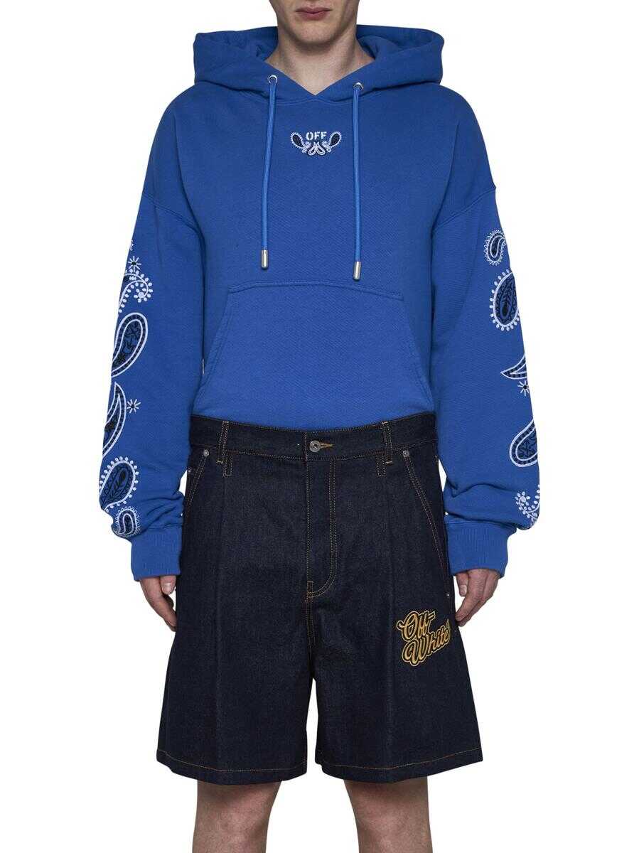 Off-White's blue denim shorts featuring belt loops, button and zip fly, 90s style logo embroidered on the front, five pocket cut, wide leg with front pleat and logo label on the back.