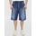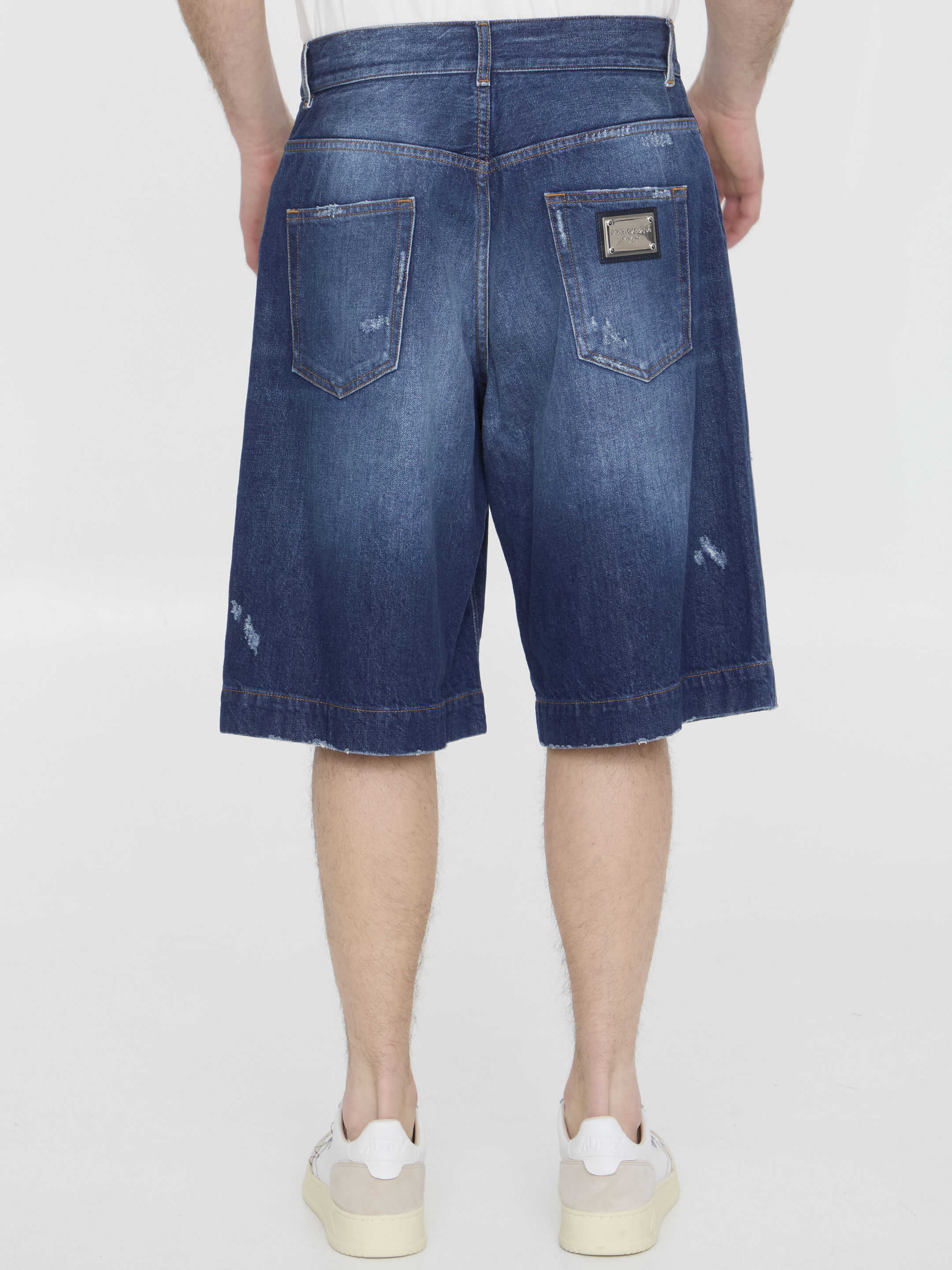 Délavé blue denim bermuda shorts with distressed details. It features zip and button closure, five-pocket design and metallic logo plate at the back. Regular fit.