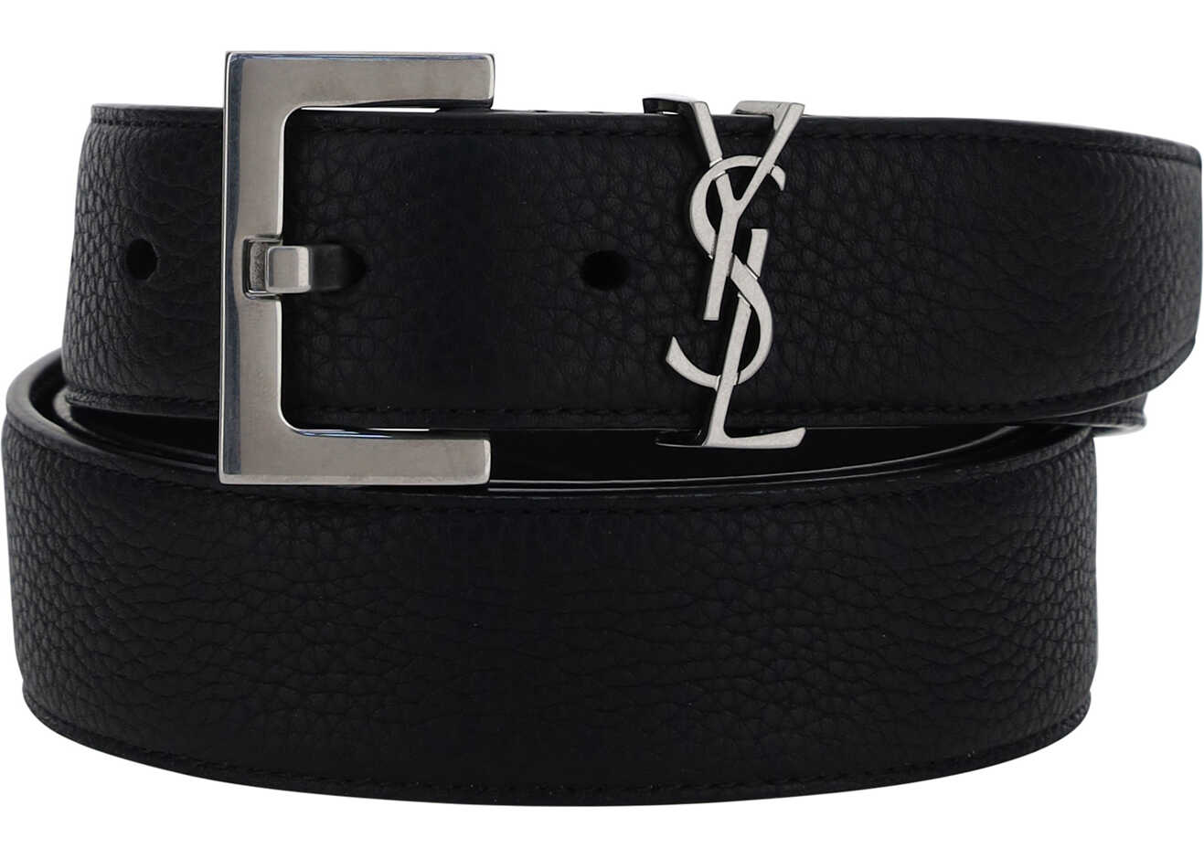 Calfskin Belt by Saint Laurent, loop detail with iconic YSL logo, square metal buckle, adjustable closure.