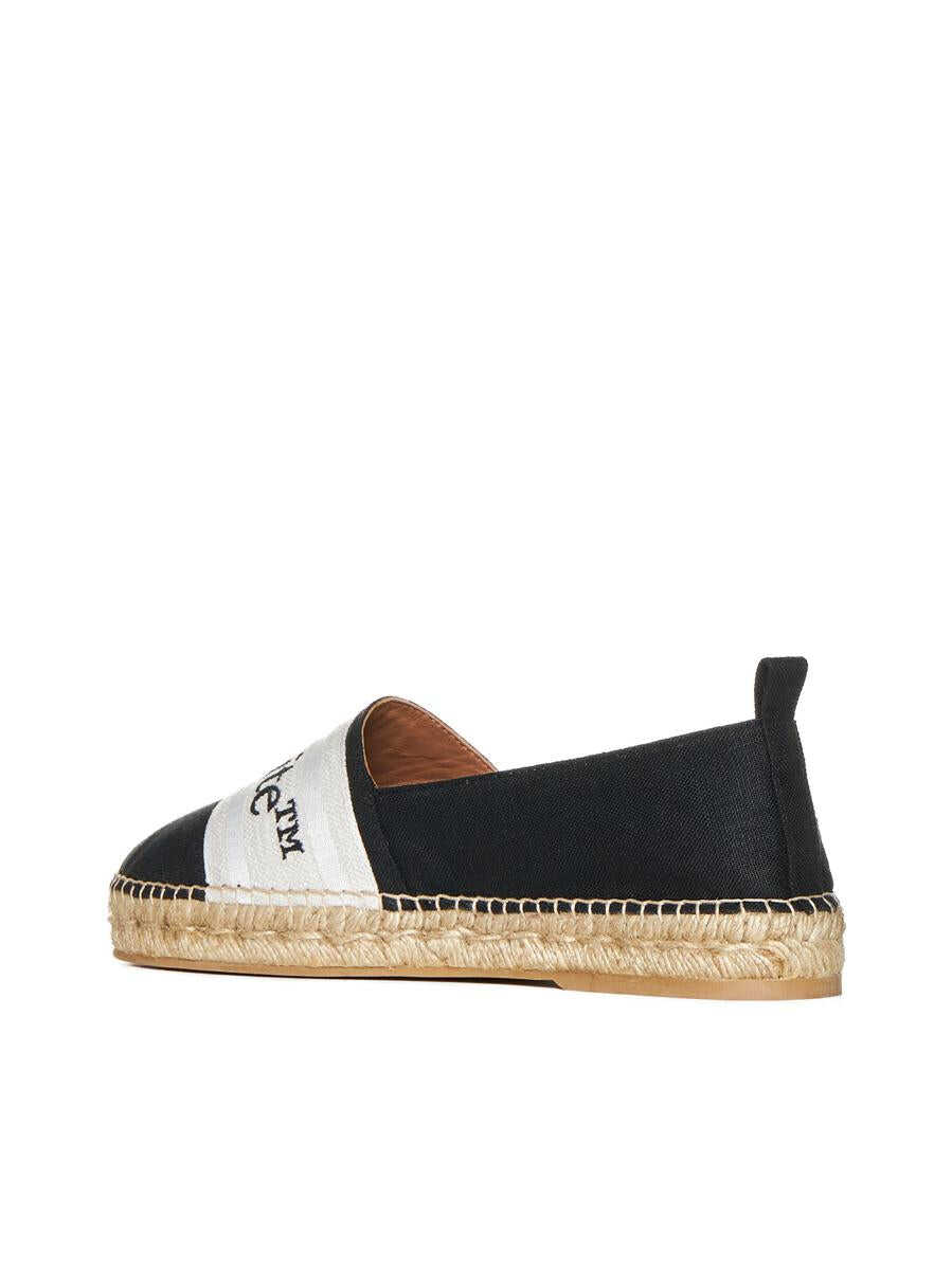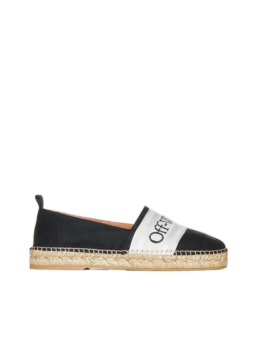 Off-White’s black linen and cotton espadrilles featuring a rounded toe, white front band with embroidered lettering logo, heel loop tab, leather lining and raffia and rubber sole.