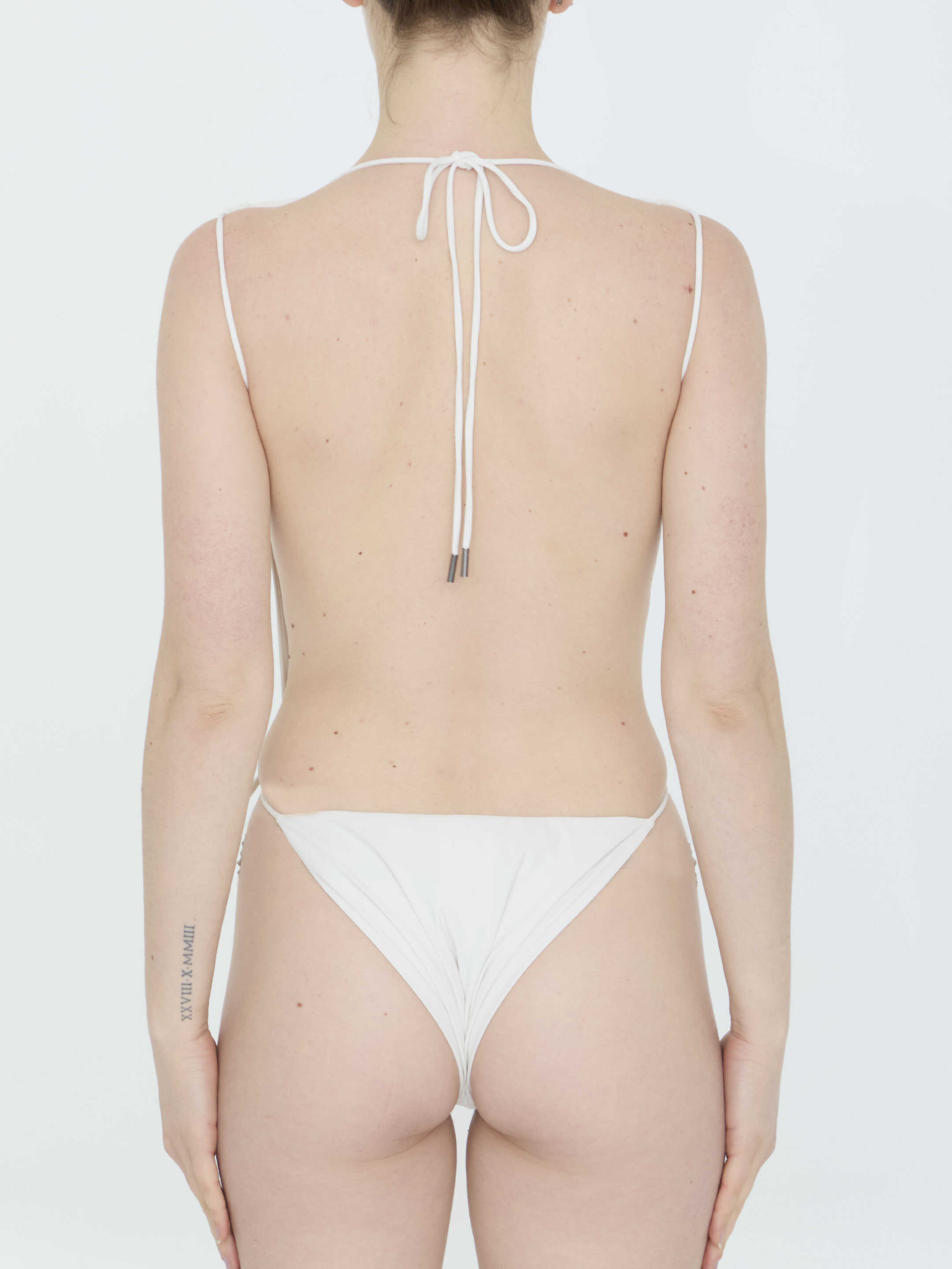 Backless one-piece swimsuit with high-cut leg. It features a gathered plunging V-halter front and open sides, adjustable string at the back neck and waist and brief bottom. Regular fit.