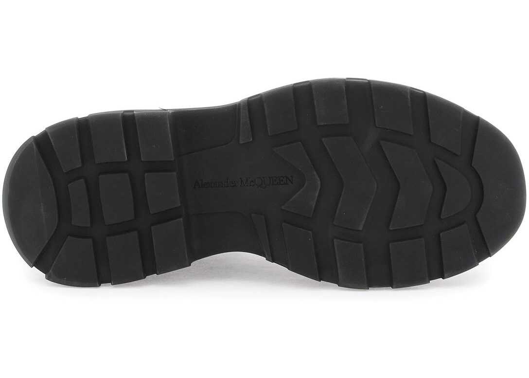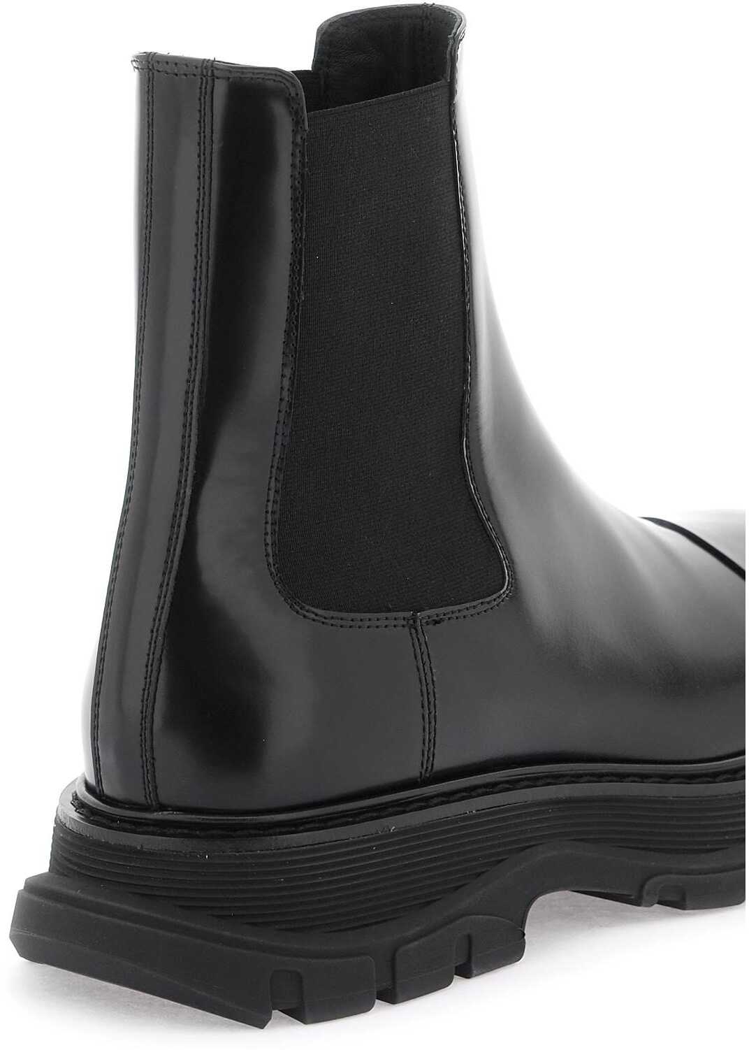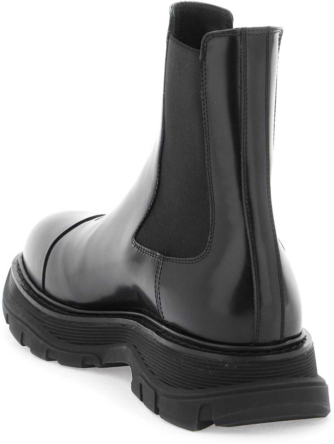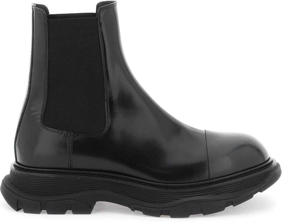 The Alexander McQueen Chelsea Tread ankle boots are made of brushed leather with characteristic elastic panels on the sides and a reinforced insert on the toe. The interior is lined in leather and features an oversized rubber tread sole for added durability.