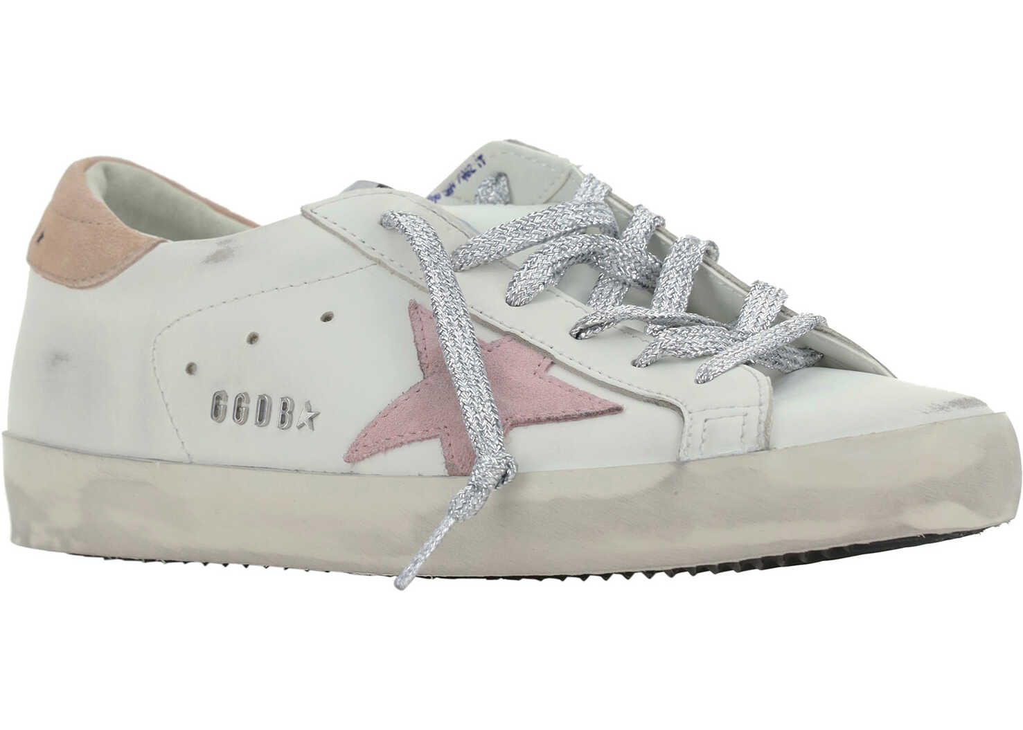 Calfskin Super Star Sneakers by Golden Goose, lace-up front closure, iconic star on contrasting side panel, flat sole, brand logo press-stamped on outer side panel, contrasting embroidered iconic brand monogram label on front tongue, contrasting heel label.
