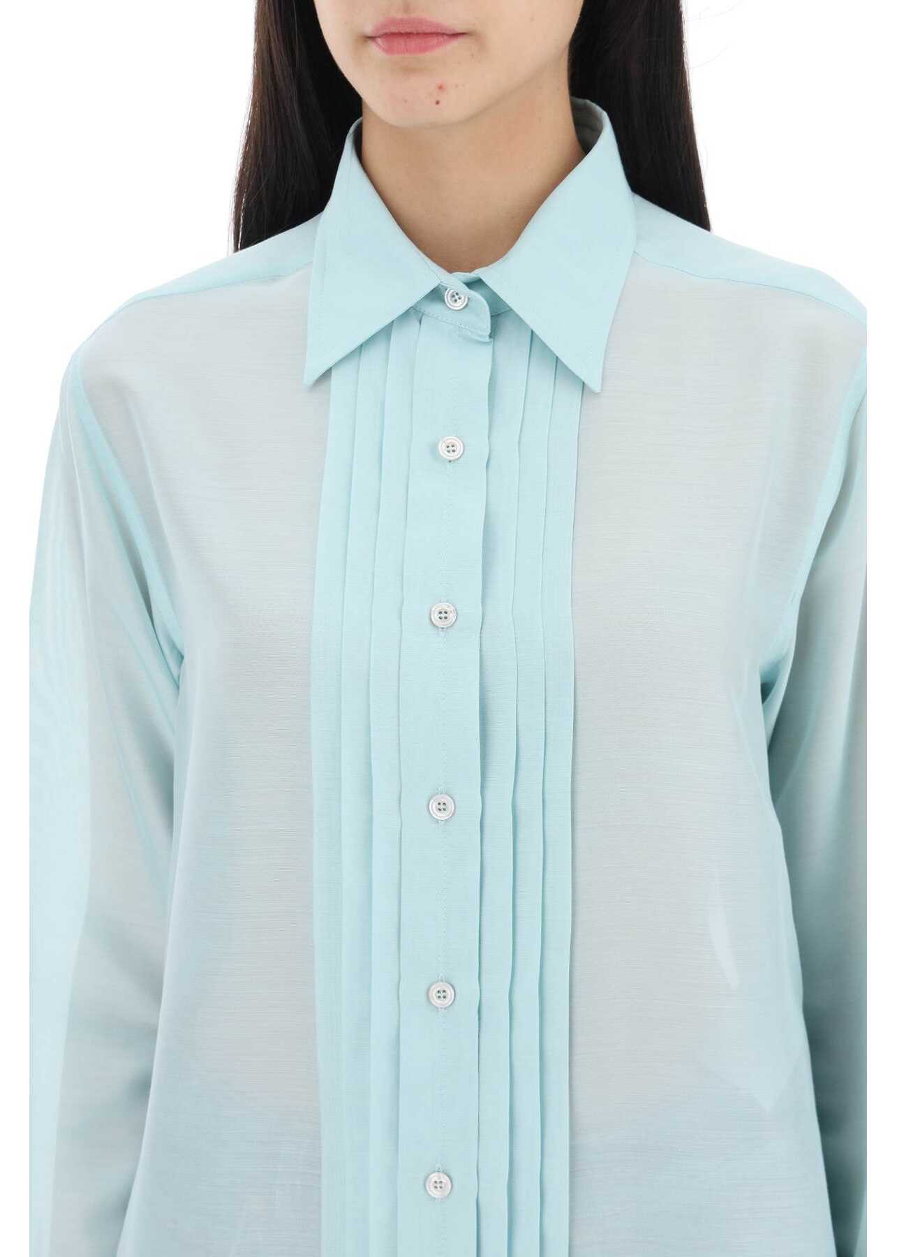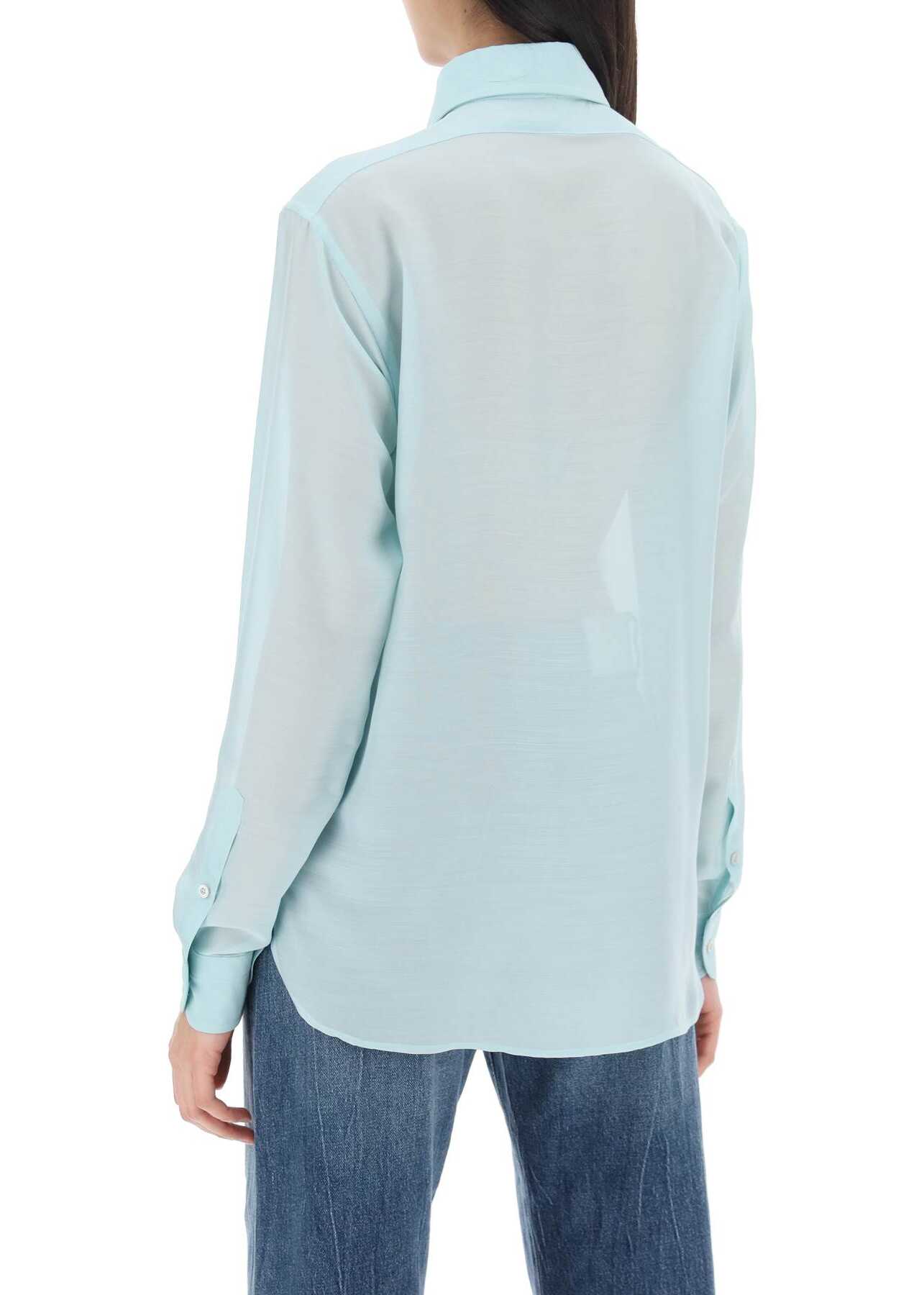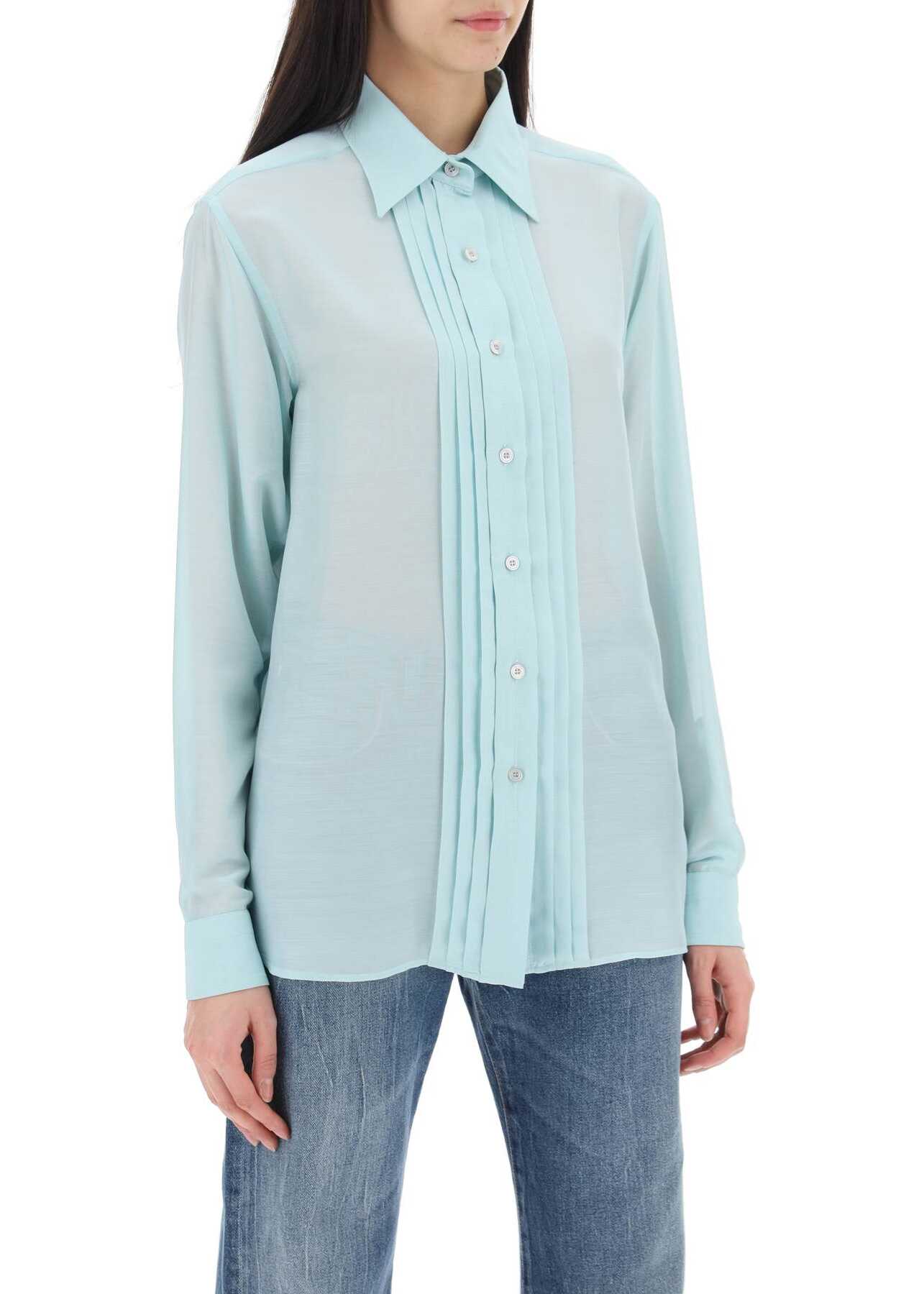 This Tom Ford shirt features a straight and fluid silhouette, crafted from charmeuse silk with a pleated plastron. It is fastened with buttons and has a pointed collar, classic cuffs, and rounded side slits. The model is 177 cm tall and wears an Italian size 40.
