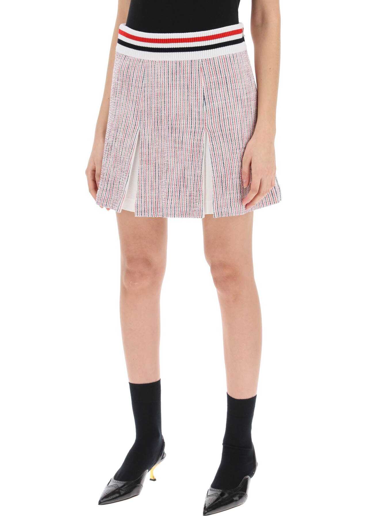 This Thom Browne miniskirt, made of cotton seersucker tweed, is characterized by its iconic striped pattern and pleated design that creates a flared silhouette. Finished with a tricolor ribbed waistband and invisible side zip, it features the "name tag" appliqué on the hem and a tricolor grosgrain tab on the back. Lined. The model is 177 cm tall and wears size IT 40.