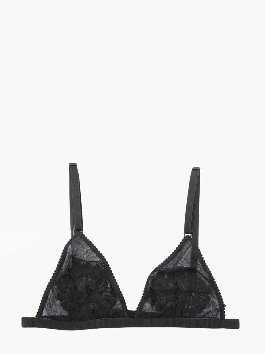 Soft-cup triangle bra in black tulle with lace details. Adjustable stretch straps. Adjustable hook-and-eye fastenings on the center back.
