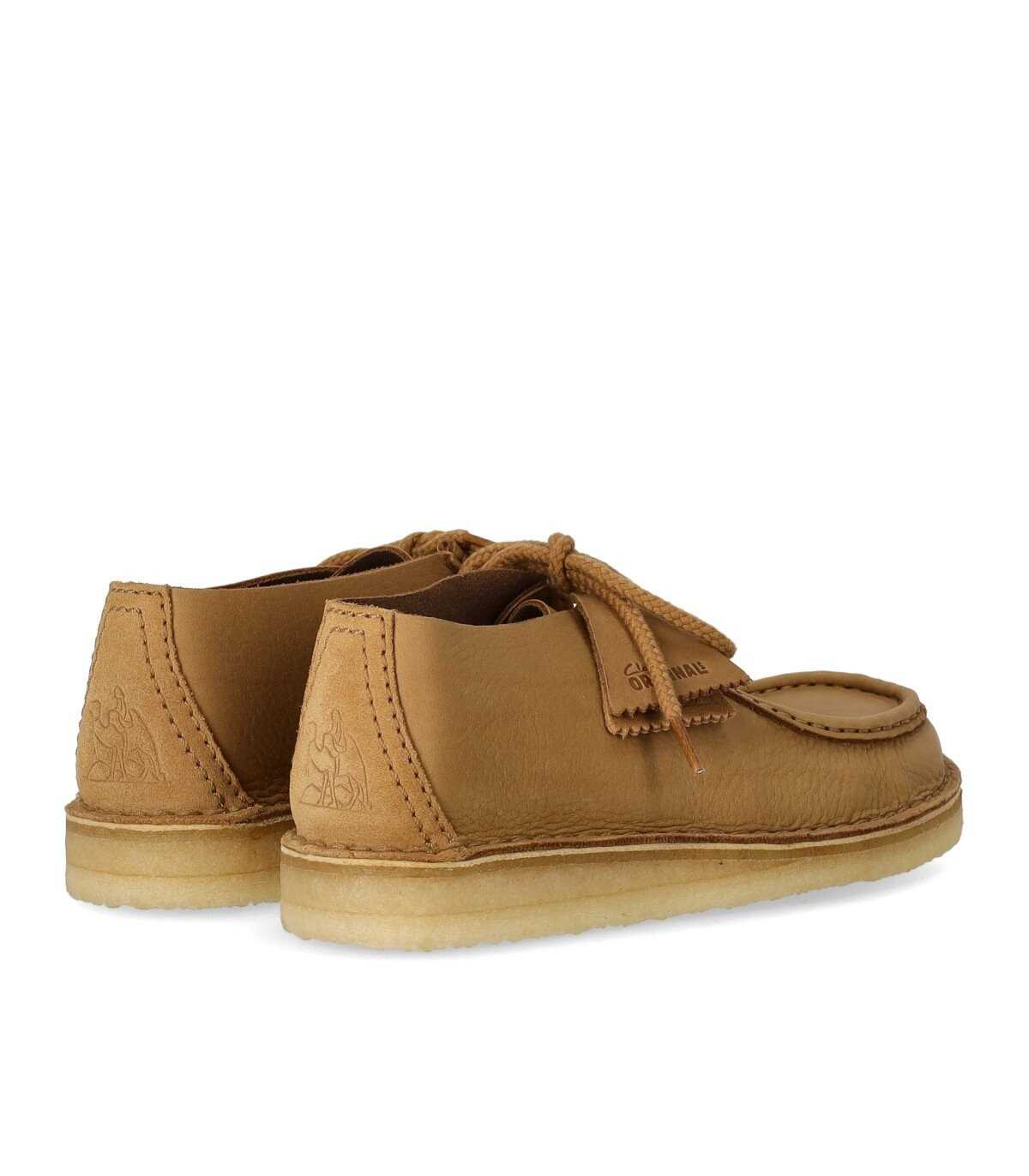 Clarks Desert Nomad ankle boot made of light brown leather. The model is a mix of the iconic Wallabee and Desert Trek, characterized by a square toe, leather lining, and a logo-engraved heel. Rope laces and a rubber sole, 3 cm high.