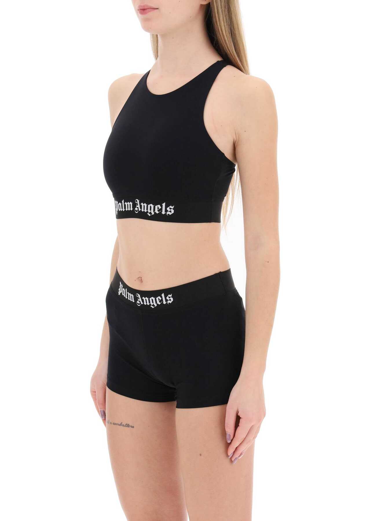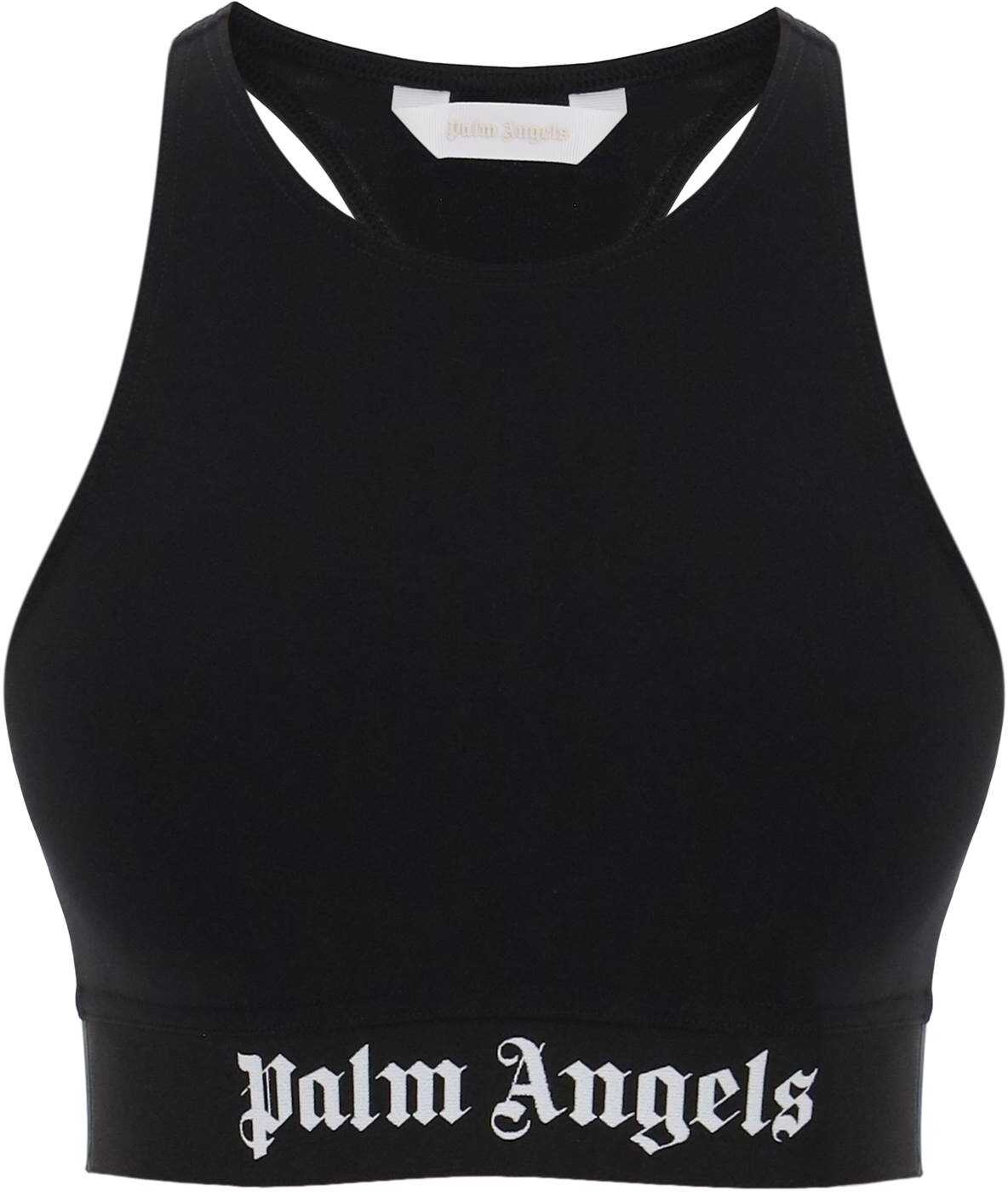 Palm Angels' sports bra with a racerback neckline, made of lycra with a branded elastic band at the bottom. The model is 177 cm tall and wears a size S.