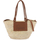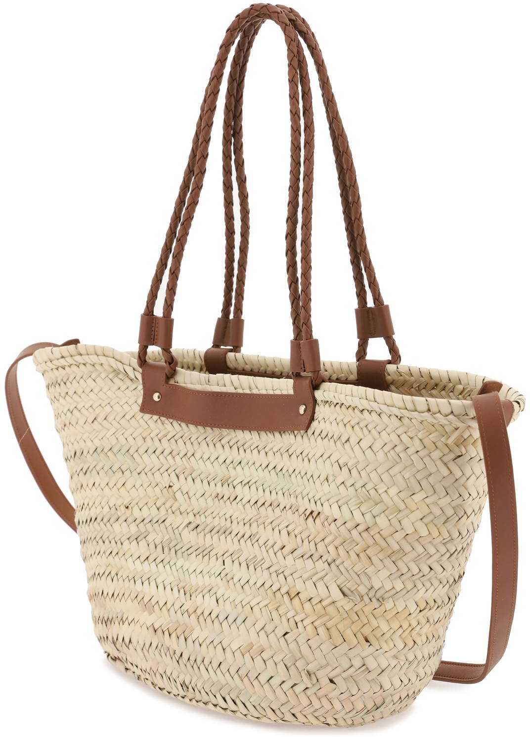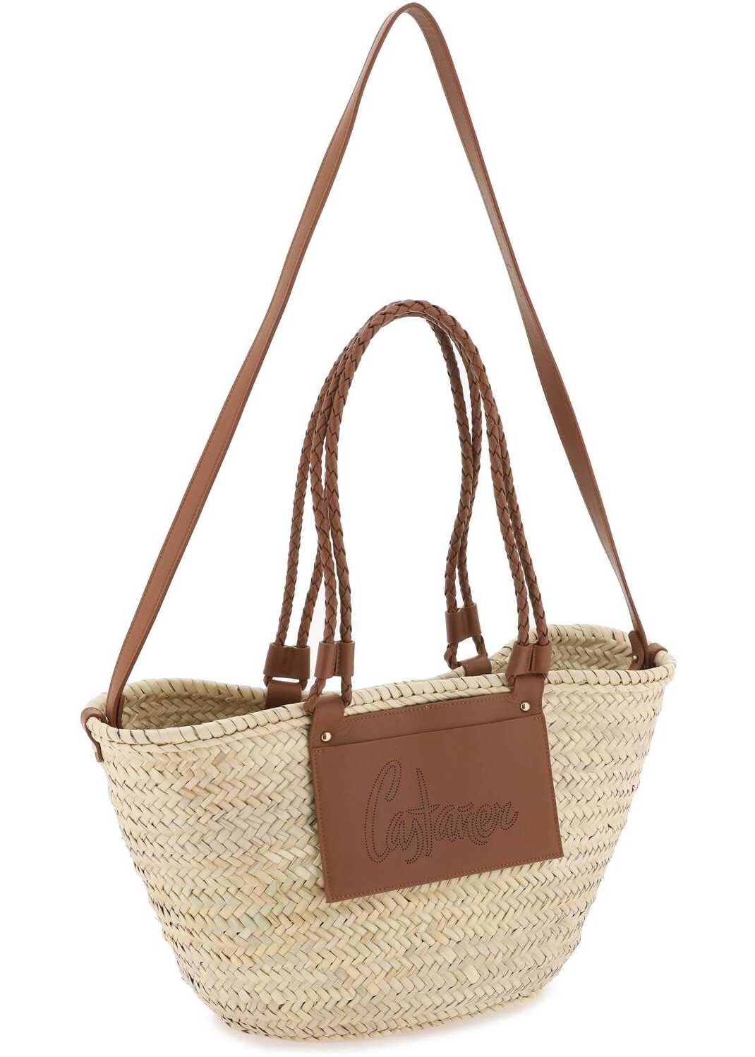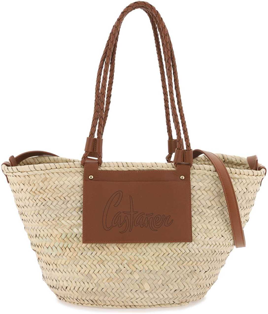 The Panier Bag by Castaner is made of woven raffia with handles and a front pocket decorated with a perforated leather logo. The interior features a removable canvas pouch, a detachable shoulder strap, and gold-finished metal accessories.