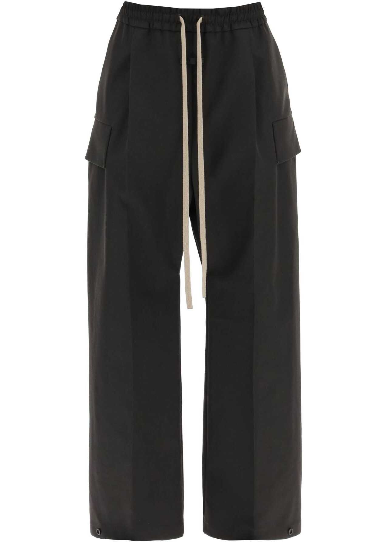 Inspired by military style, these Fear Of God cargo pants are made of heavy twill wool and cotton with a wide leg and low crotch. They feature an elastic waistband with extended drawstring, French side pockets, utility pockets, front darts, and pressed pleats on the front and back. The iconic leather logo label is placed on the front. The model is 187 cm tall and wears size M.