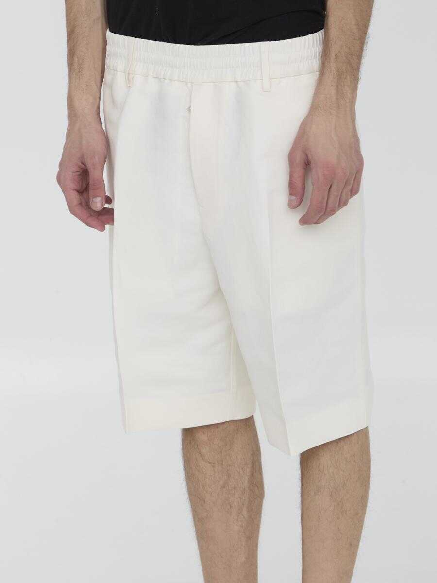 Tailored bermuda shorts in pearl-colored canvas. It features elasticated waistband with drawstring, zip closure, two side welt pockets, one rear welt pocket and belt loops. Relaxed fit.
