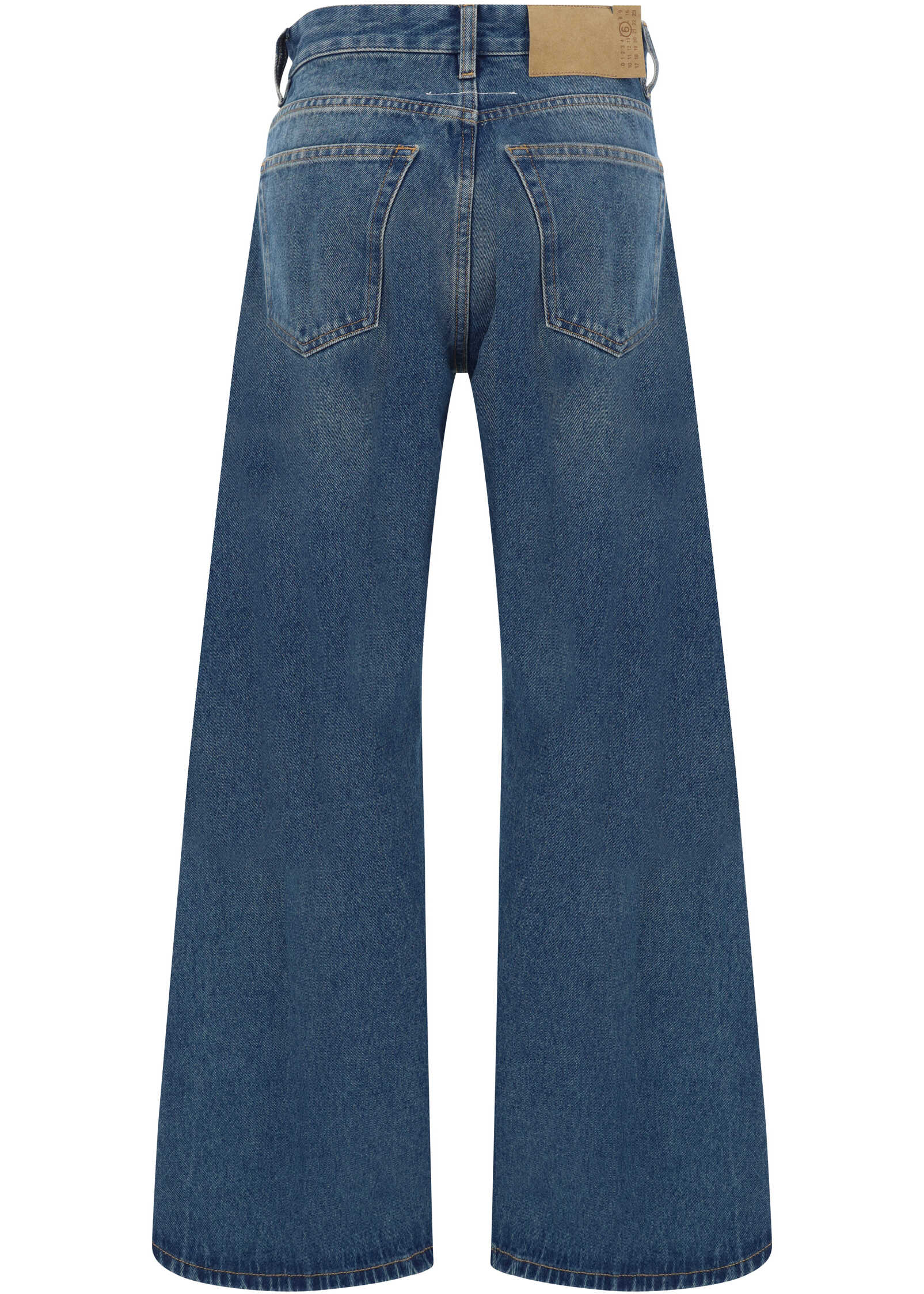 Cotton Jeans by MM6, wide-leg five-pocket style, front button and zipper closure, belt loops waistband, iconic leather patch with signature brand pressure-printed applique on back.