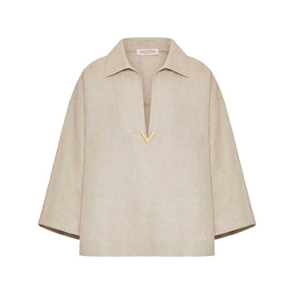 Valentino ready to wear light beige linen gold-tone logo plaque spread collar three-quarter length sleeves the full look includes valentino garavani accessories. this item contains at least 50% materials which are certified or widely recognised as having a lower environmental impact through production and/or manufacturing processes that reduce water consumption and the use of harmful chemicals, or re-use by-products of the production process.