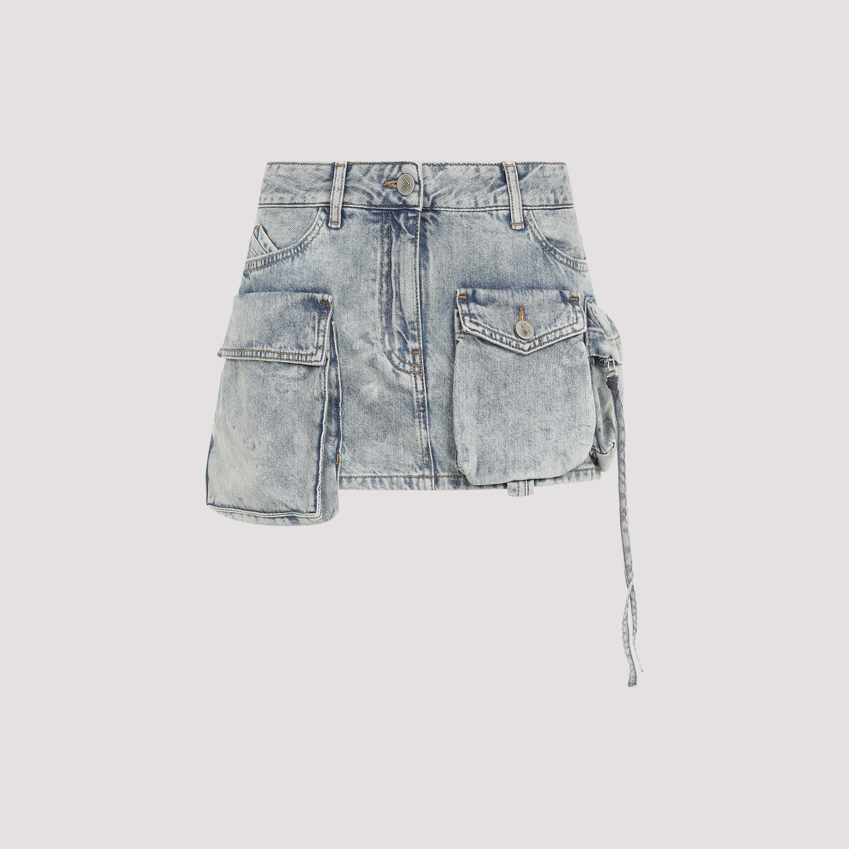 Elevate your style with the chic Attico Fay bleached blue cotton mini skirt. This trendy skirt features a low-rise design, belt loops, and a front button and fly-zip closure. With a 5-pocket design and a mini length, it is perfect for any occasion. Add this stylish piece to your wardrobe today!