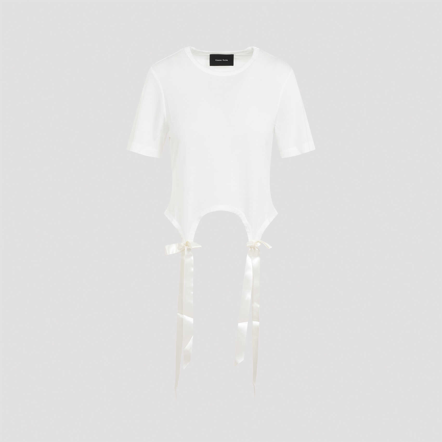 Elevate your wardrobe with the SIMONE ROCHA 5223.0571 t-shirt. Crafted from 100% cotton in a classic white hue, this top features satin bow tail accents, a flattering scoop neck, and gathered darts for a feminine touch. The cropped hem, crew neckline, and short sleeves make it a versatile piece for any occasion. Add a touch of luxury to your everyday look with this must-have from SIMONE ROCHA.