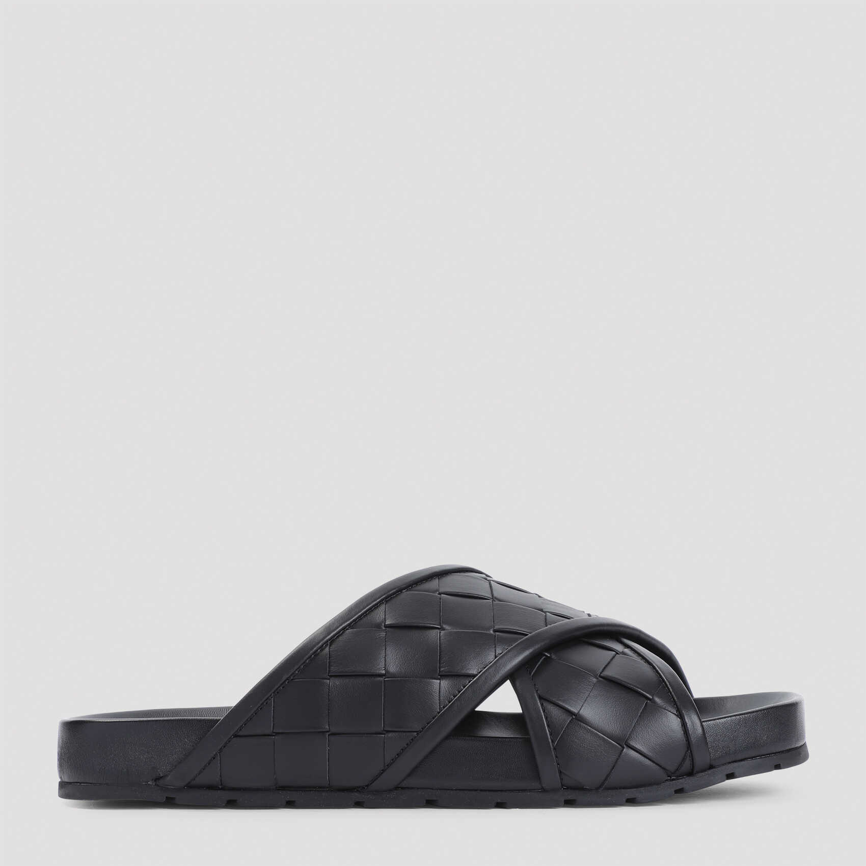 Step out in style with the BOTTEGA VENETA 786883.V3HB0 sandal. Crafted from luxurious black calf leather, this sandal features a round and open toe, top cross straps with signature intreccio details, and a comfortable flat sole. Elevate your look with this sleek and sophisticated footwear choice.