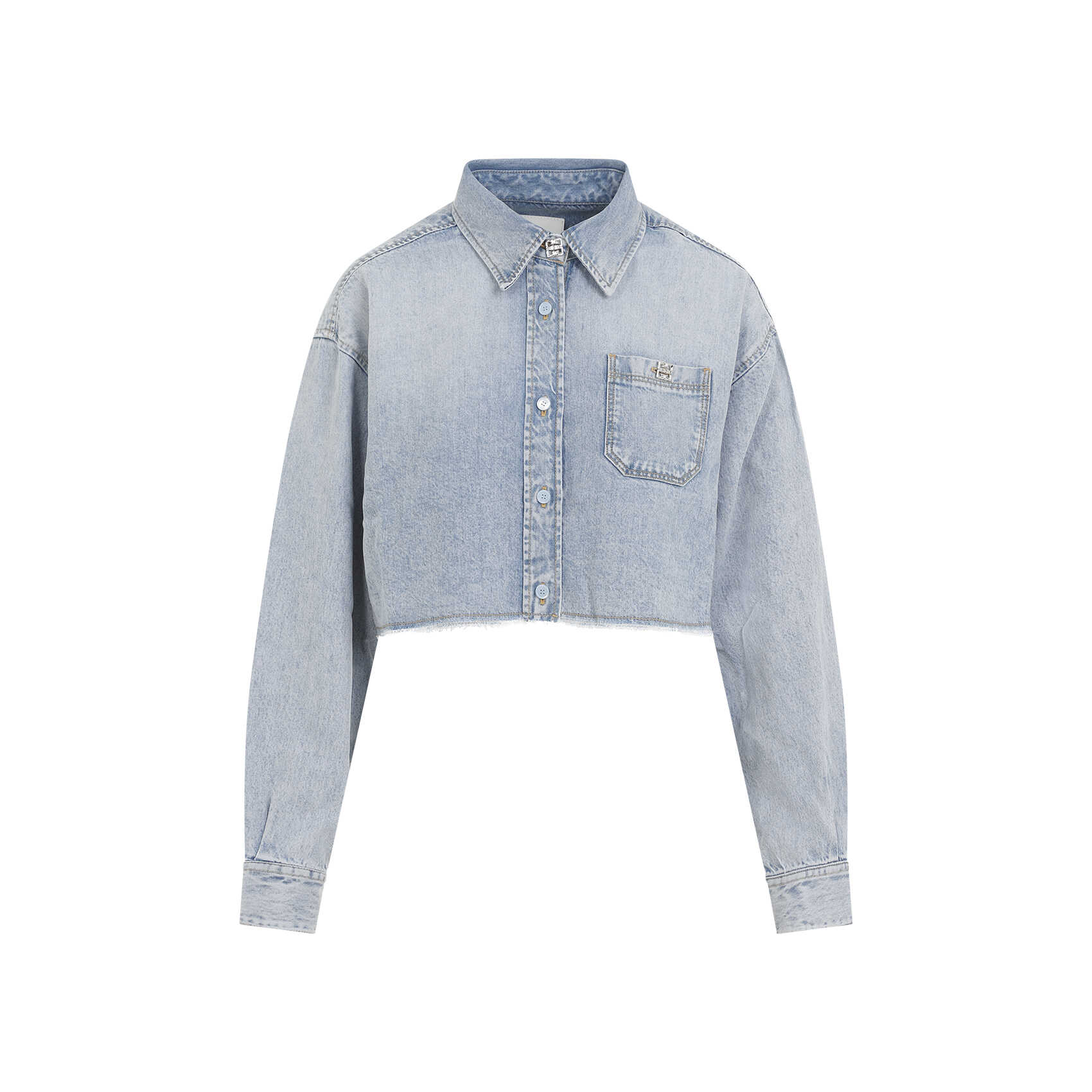 Elevate your style with this chic Givenchy lyocell shirt in a refreshing ice blue color. Featuring a pointed collar, front button fastening, and a convenient front pocket, this shirt is perfect for a casual yet sophisticated look. The dropped shoulder and cropped design add a trendy touch, making it a must-have piece for any fashion-forward woman. Crafted from high-quality lyocell material, this shirt guarantees both comfort and style in one.
