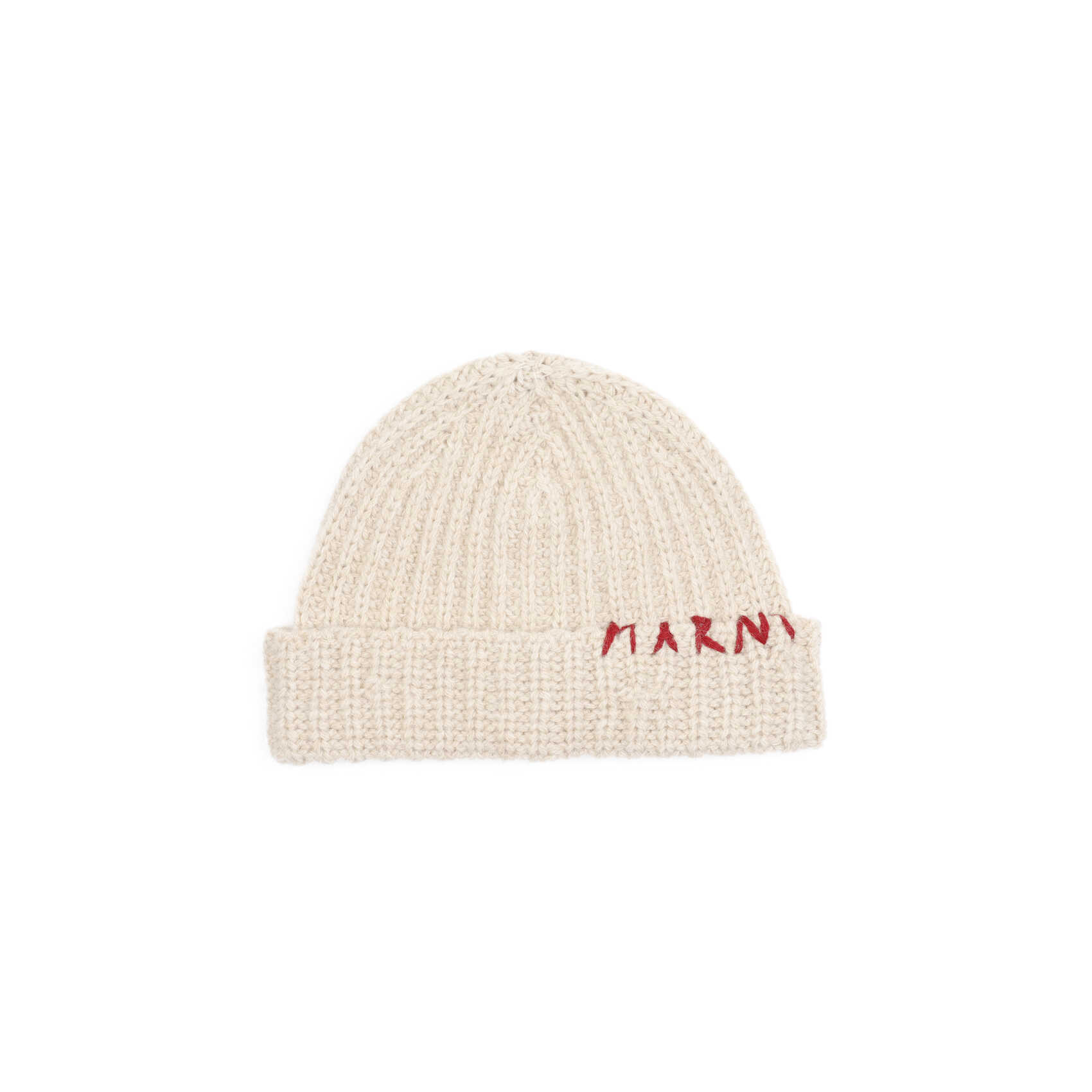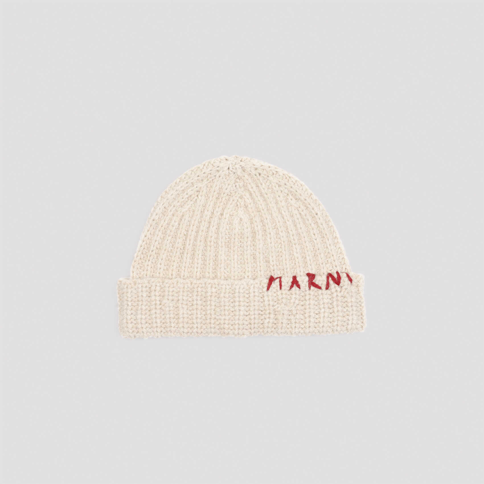 Stay stylish and warm with this MARNI Blue Virgin Wool Hat. Made from high-quality virgin wool in a classic blue color, this hat features a ribbed design, a turn-up hem, and a red embroidered logo for added flair. Perfect for adding a touch of luxury to your winter wardrobe.