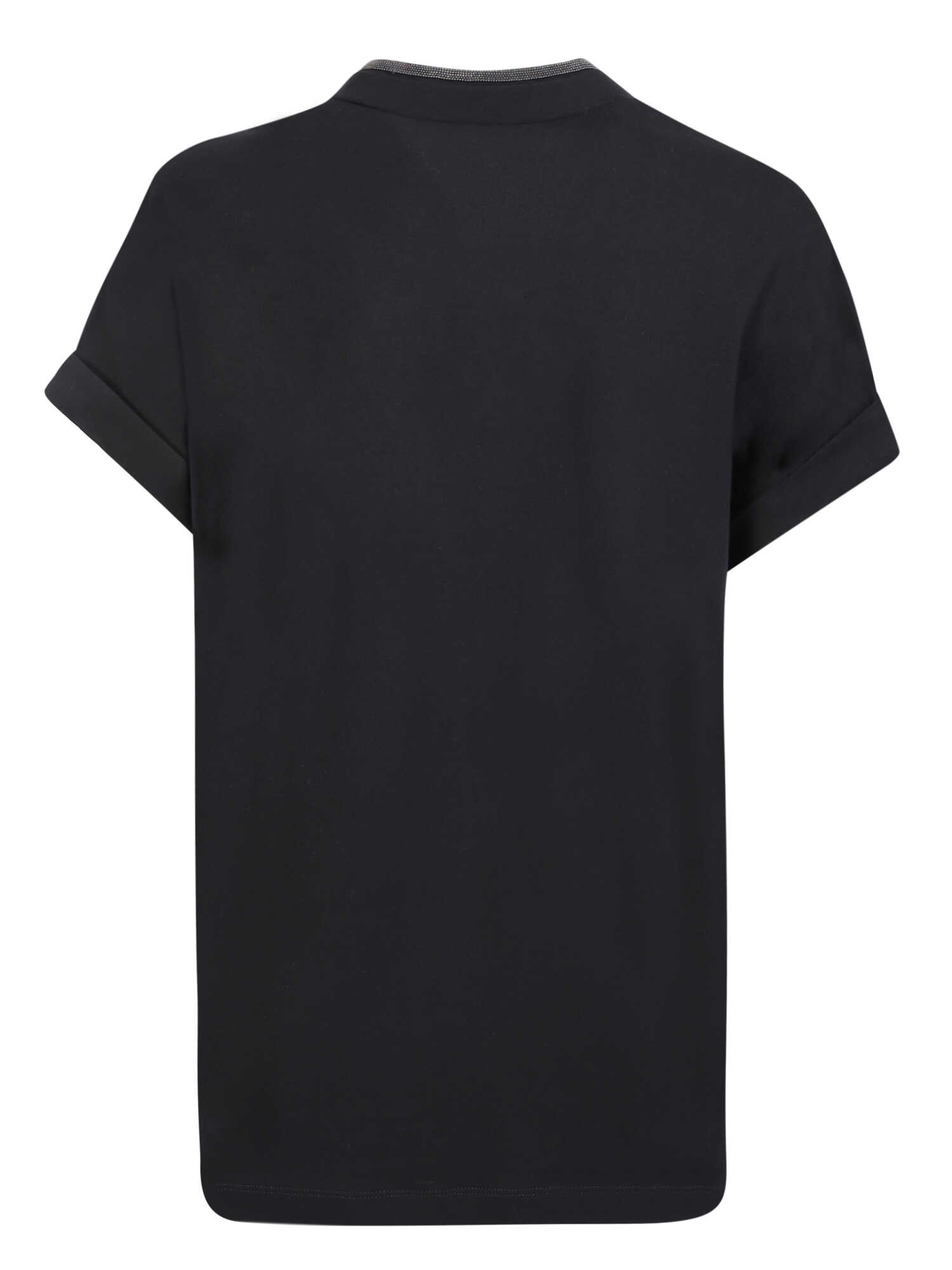 Elevate your wardrobe with this chic black t-shirt from Brunello Cucinelli. Made with 93% Cotton and 7% Elastane, this shirt features short sleeves, tonal stitching, and a regular fit for a stylish and comfortable look. Perfect for any occasion, this versatile t-shirt is a must-have for every fashion-forward woman. Add a touch of luxury to your collection with BRUNELLO CUCINELLI Black T-Shirts.