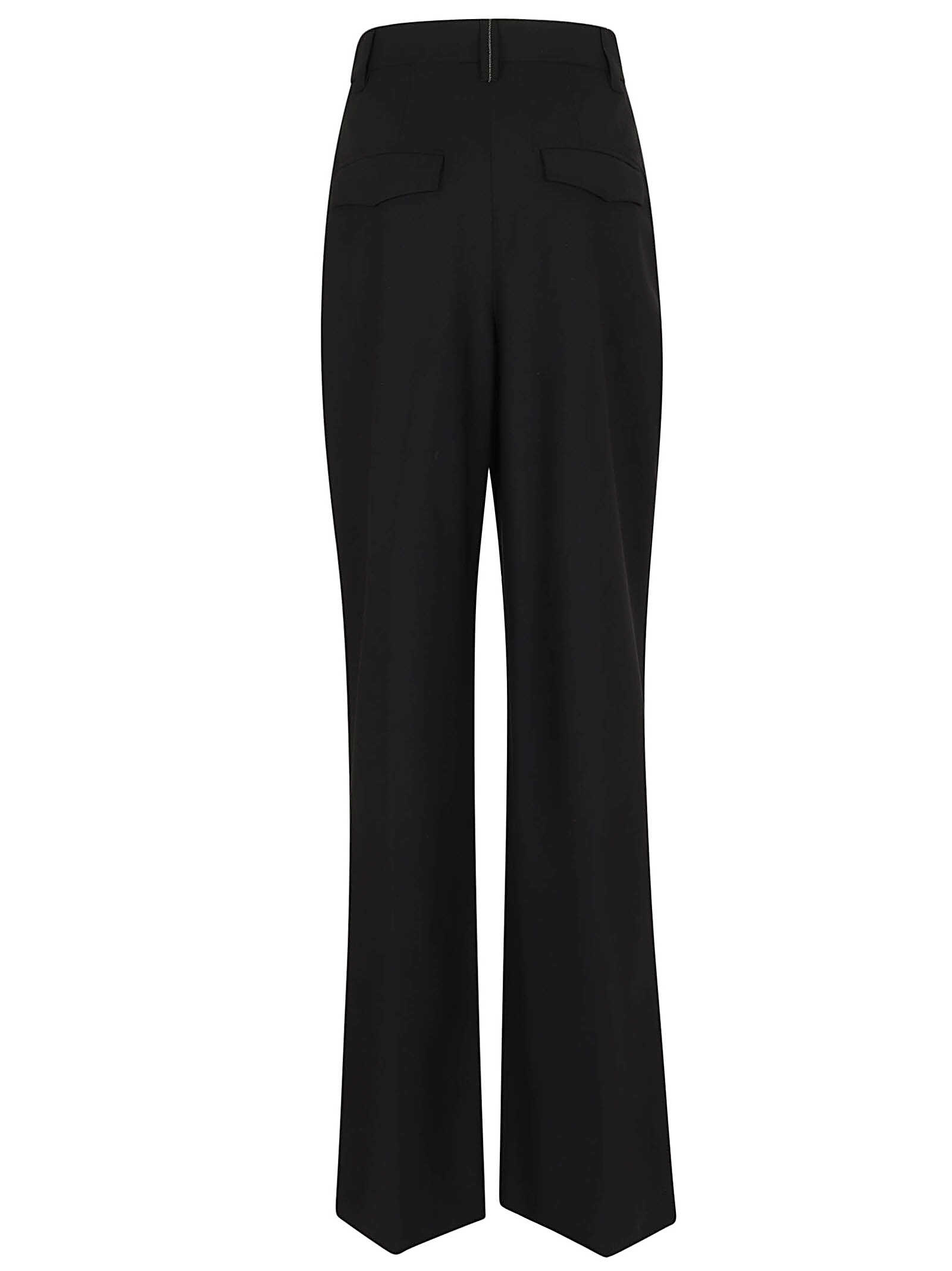 Elevate your wardrobe with these luxurious black trousers from Brunello Cucinelli. Made from a blend of tropical luxury wool, they feature a high waist design with a loose fit for ultimate comfort. The nickel-free monili decoration detail adds a touch of elegance. Perfect for any occasion, these trousers are a must-have for the modern woman. Get yours today and experience the unmatched quality and style of Brunello Cucinelli.