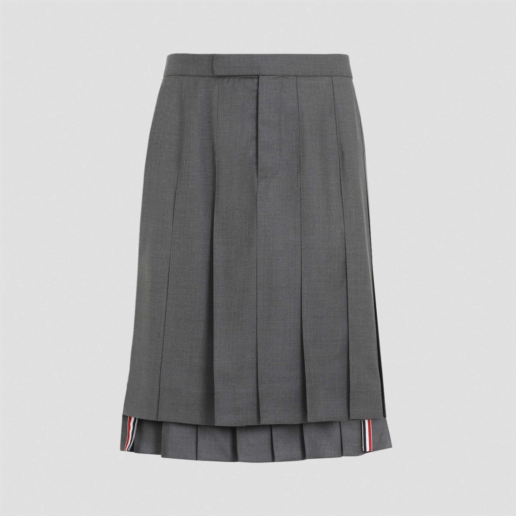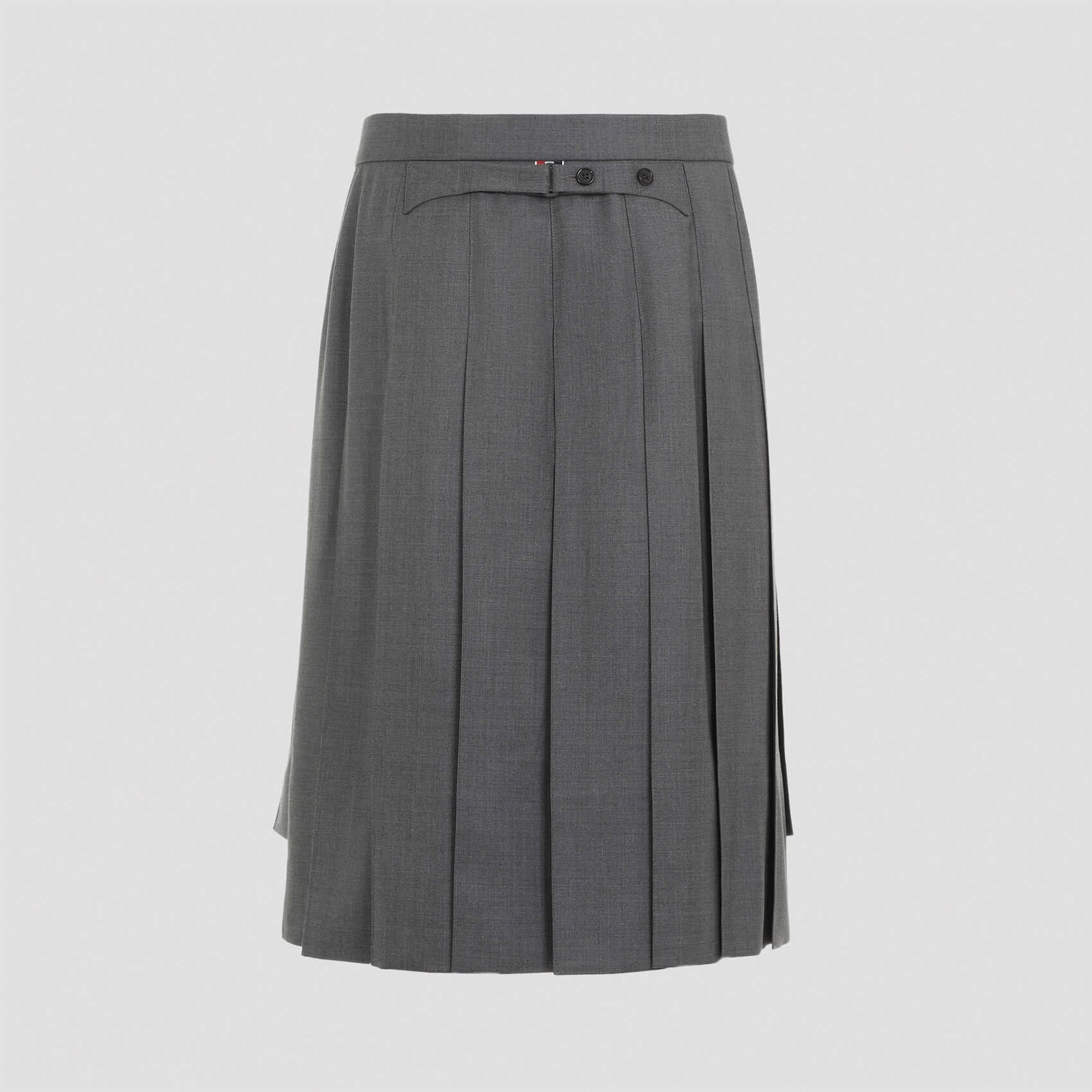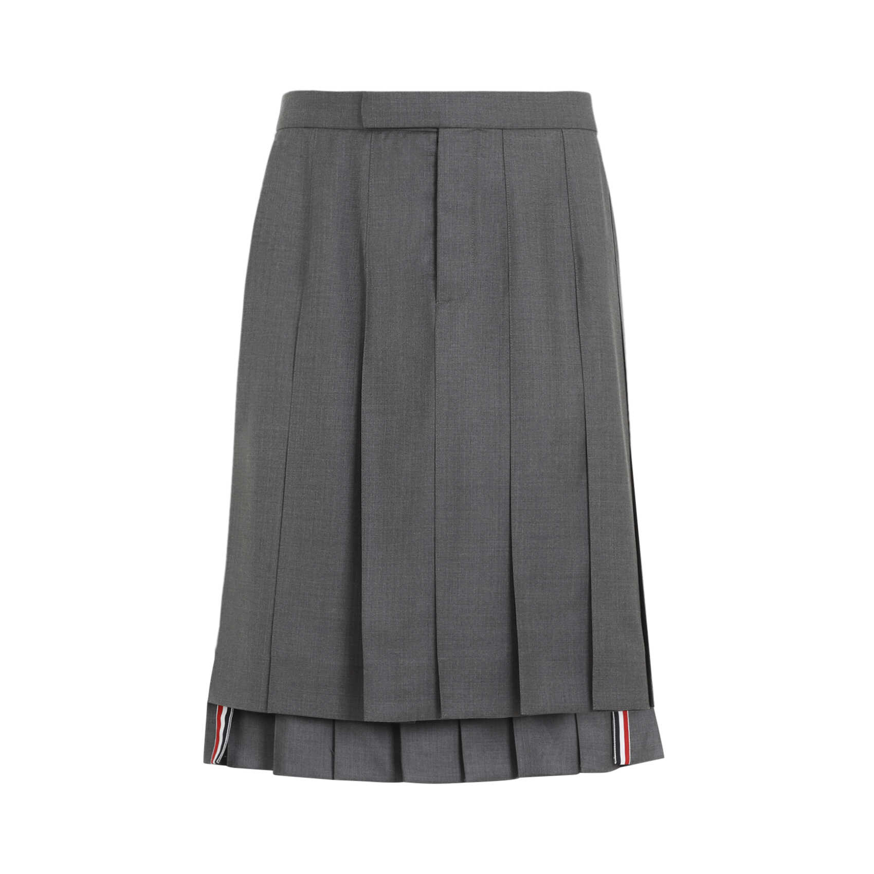 Elevate your style with this Thom Browne grey wool skirt. Featuring a classic rise backstrap design, pleated detailing, and adjustable button-tab closure for a perfect fit. The tonal 4-stripes detail and signature grosgrain trim add a touch of sophistication. Make a statement with this stylish and versatile piece.