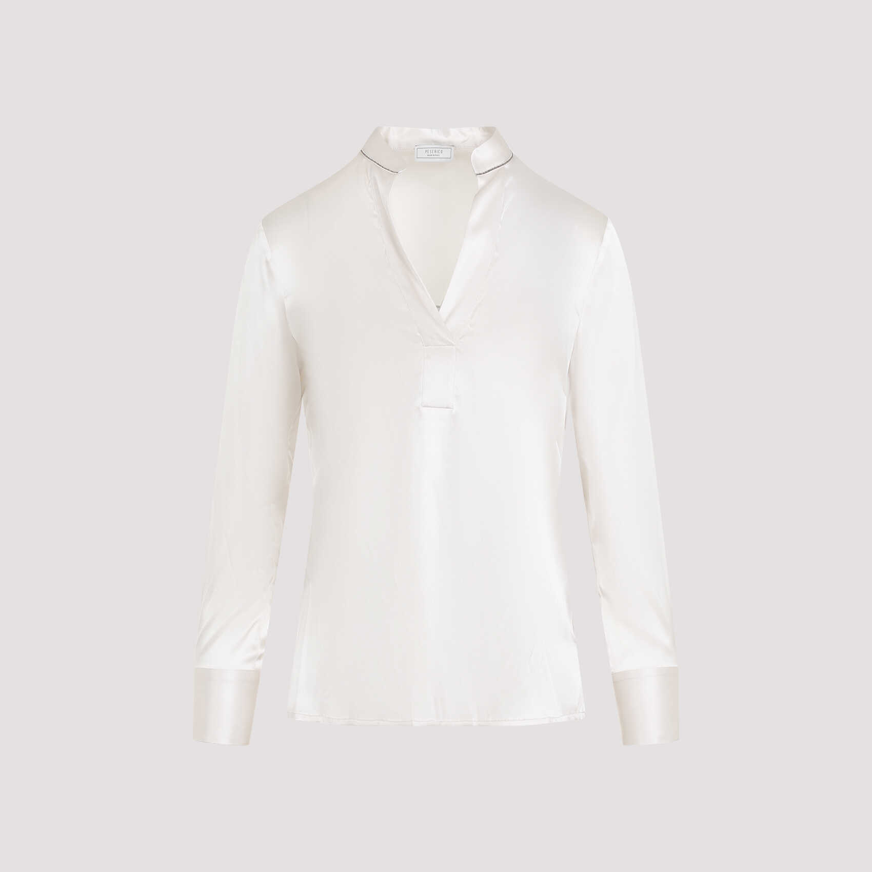 Elevate your style with this elegant White Silk shirt from PESERICO. Made with a luxurious blend of 97% Silk and 3% Elastane, this shirt is perfect for any occasion. The intricate design and high-quality material make it a must-have for every fashionable woman. Add a touch of sophistication to your wardrobe with PESERICO.