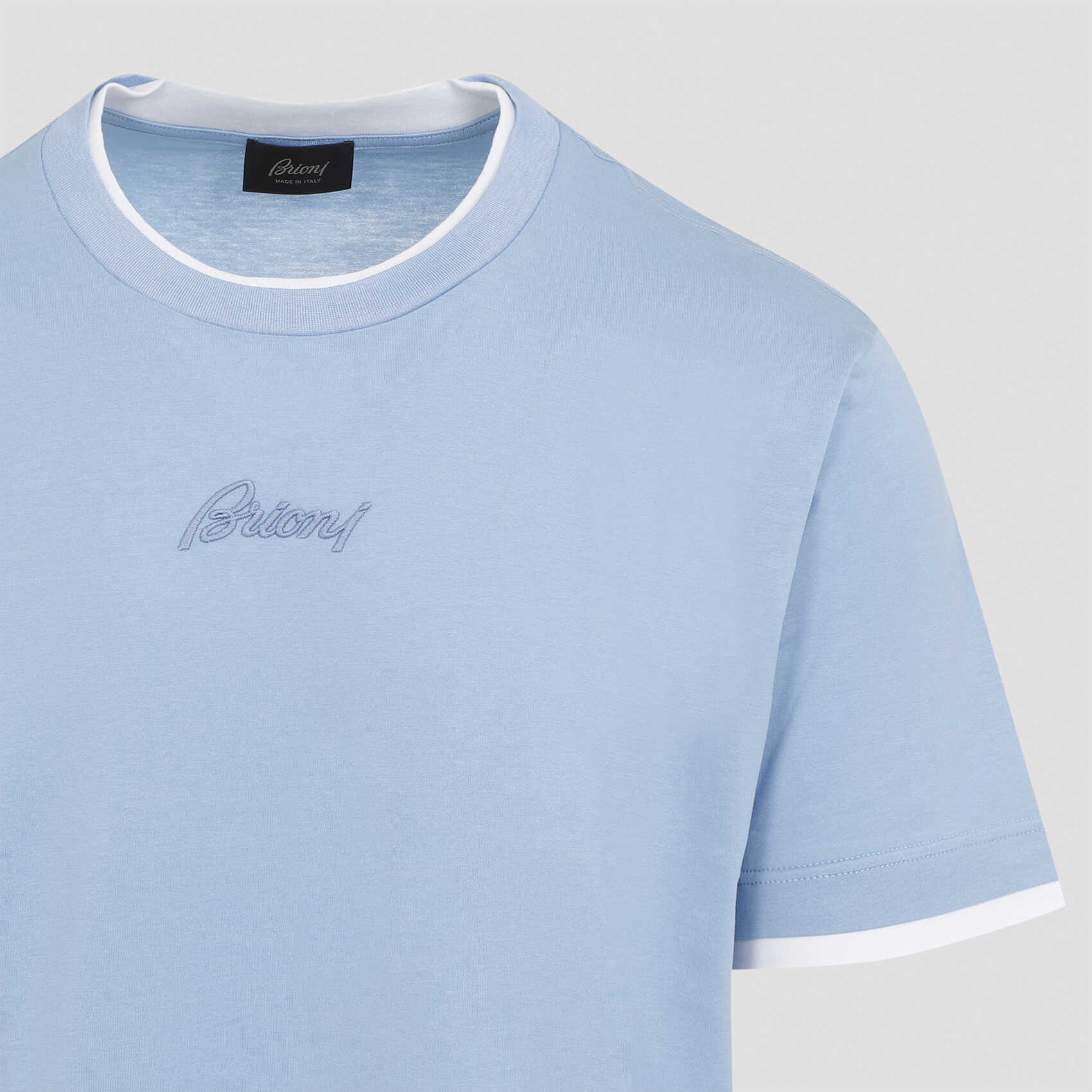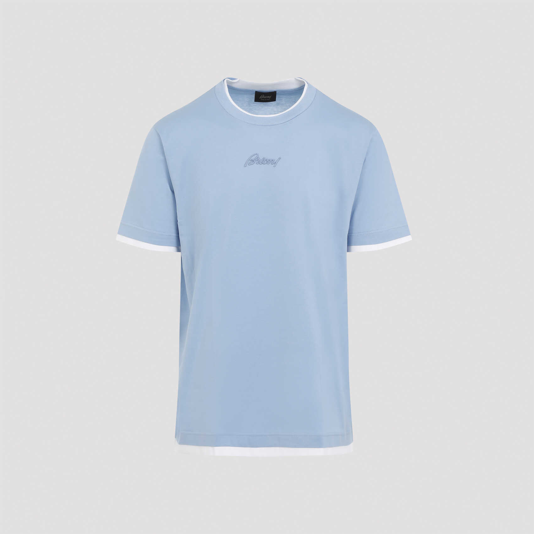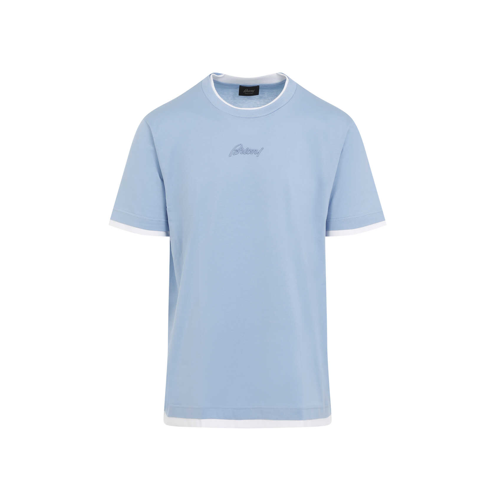 Elevate your style with this luxurious Brioni cotton t-shirt in a stunning shade of blue. Featuring a classic round neck, embroidered blue logo, and double white trims for a sophisticated touch. Made from 100% pure cotton, this t-shirt is a must-have for any fashion-forward man. Perfect for casual outings or layering under a blazer for a more polished look.