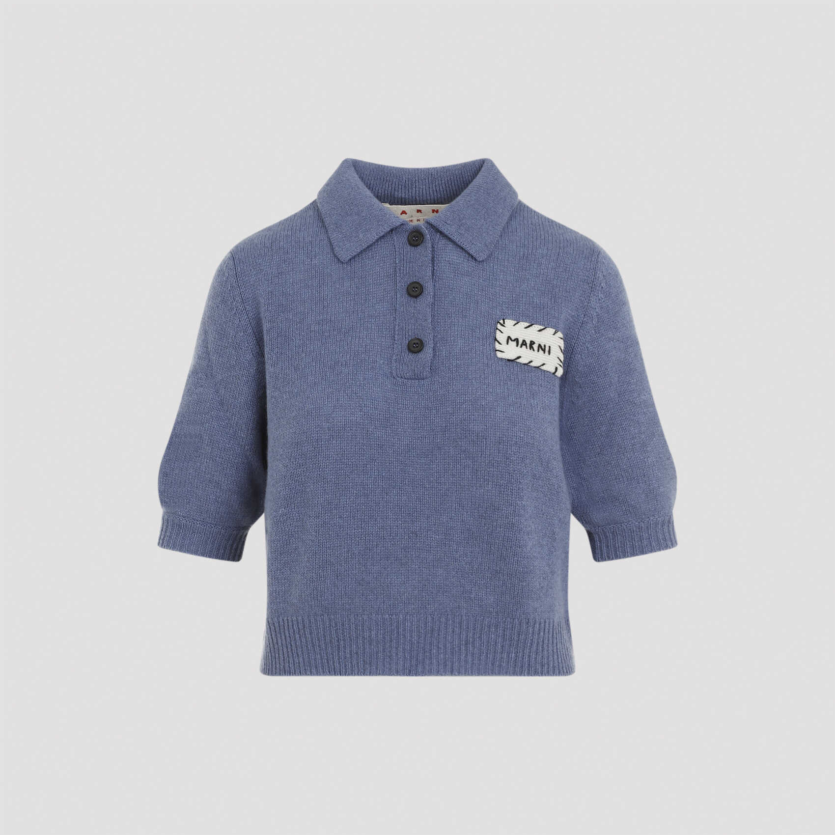 Elevate your style with the luxurious MARNI blue cashmere polo. This exquisite piece features a classic polo collar, front 3-button placket, logo patch on the chest, and short balloon sleeves. The cropped length and ribbed edges add a modern touch. Crafted from 100% cashmere, this polo is a must-have for any fashion-forward woman. Stand out from the crowd with MARNI.