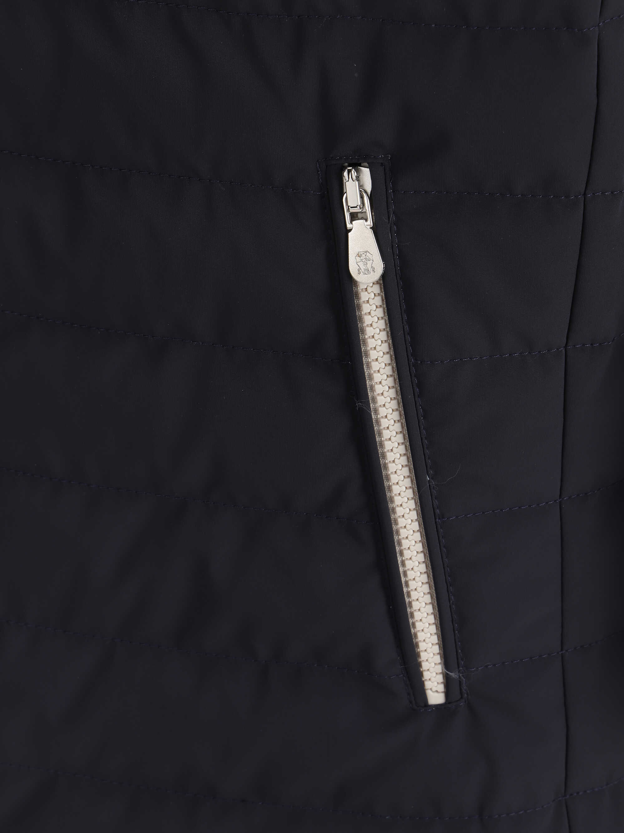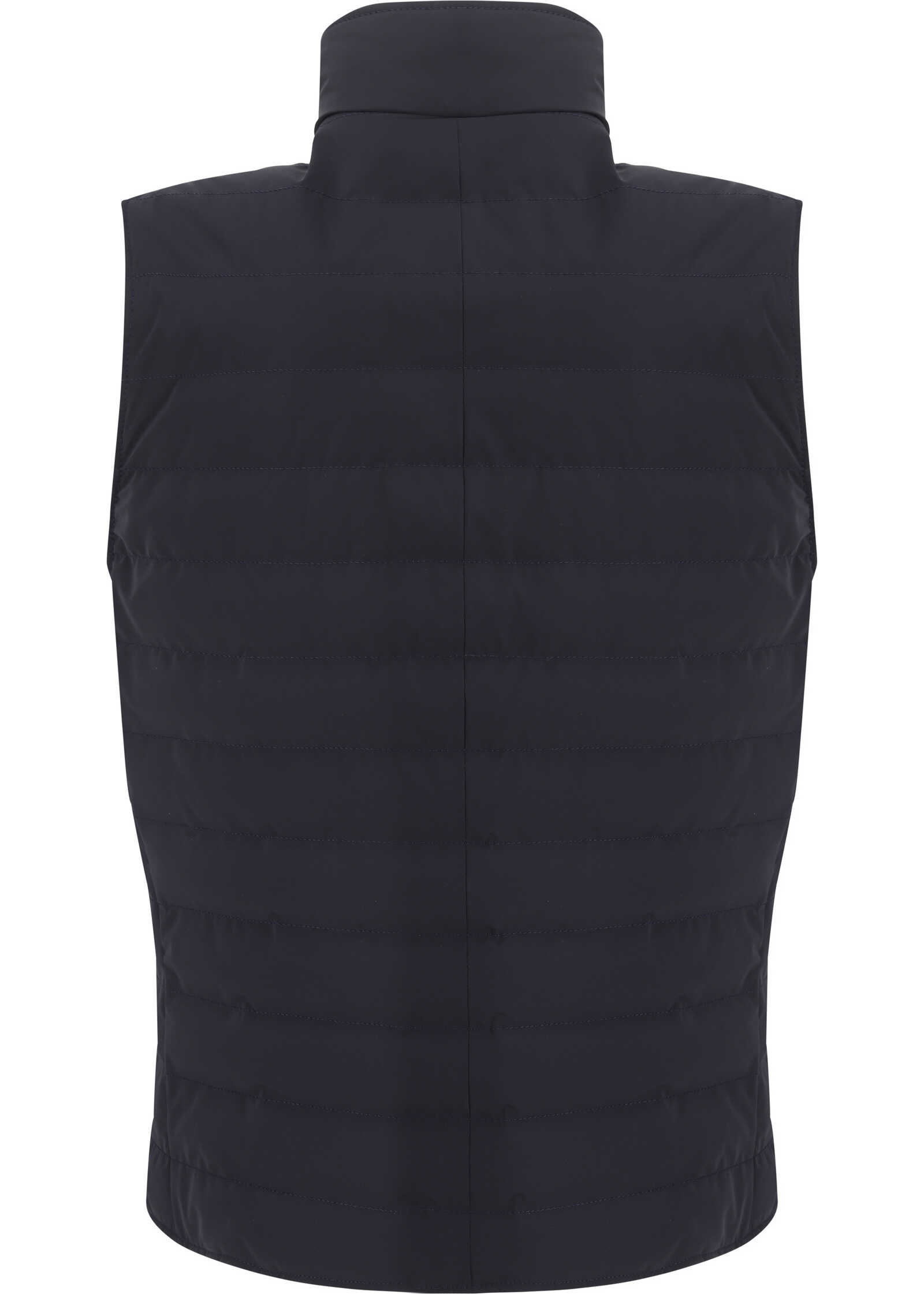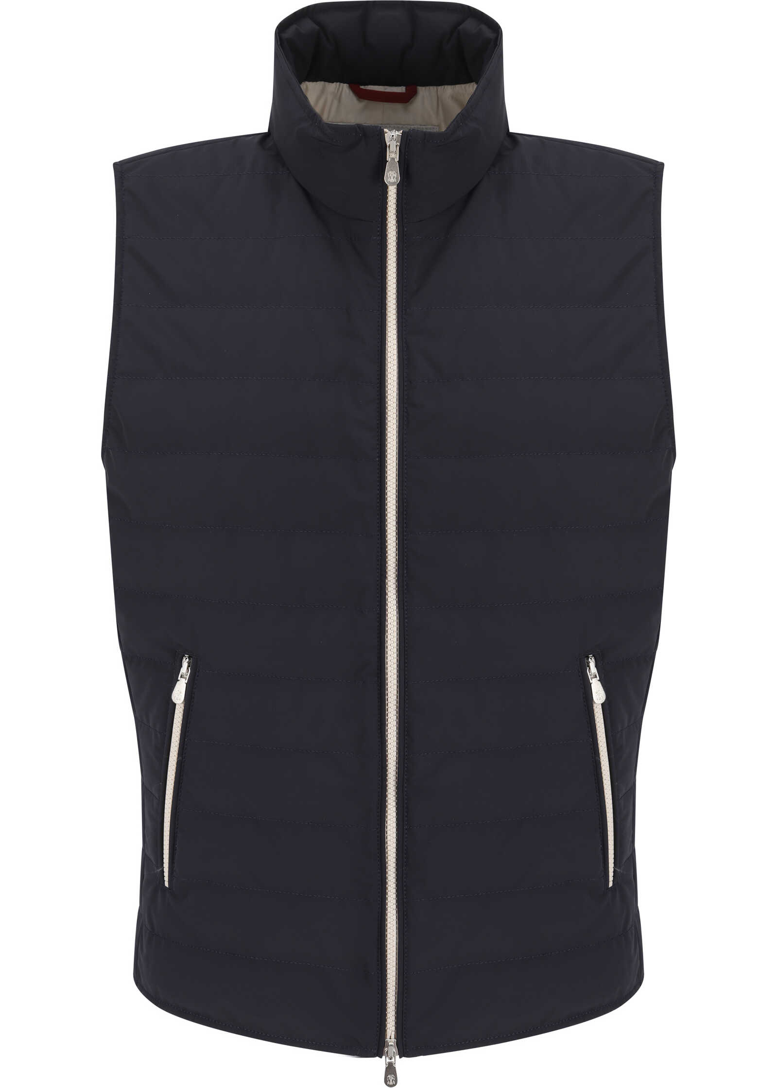 Cashmere Down Vest by Brunello Cucinelli, high-necked design, front zipper closure, monochrome ribbed padded and quilted design, two slit pockets with snap-button closure applied to the front.