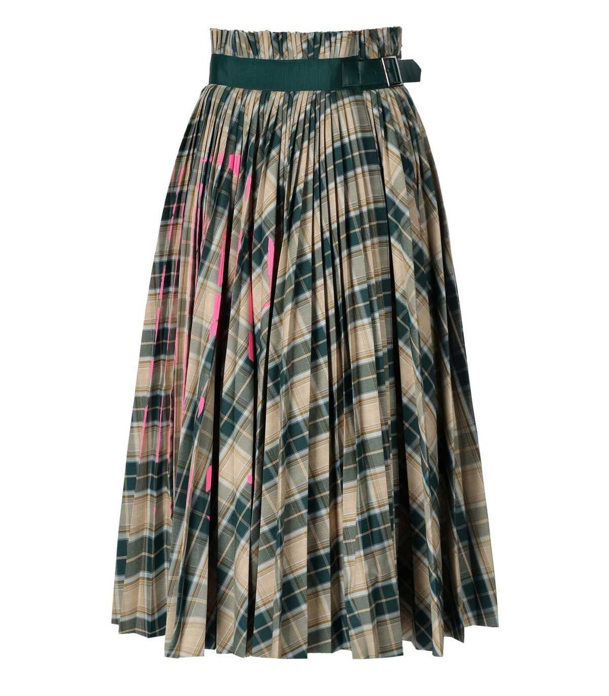 Godess skirt by Essentiel Antwerp made from recycled polyester pleated fabric, in shades of green and beige. A-line cut, button closure and buckle on the side. Fluorescent pink floral print, contrasting, relaxed fit. The model is 177 cm tall and wears size S. Composition: 100% recycled polyester.
