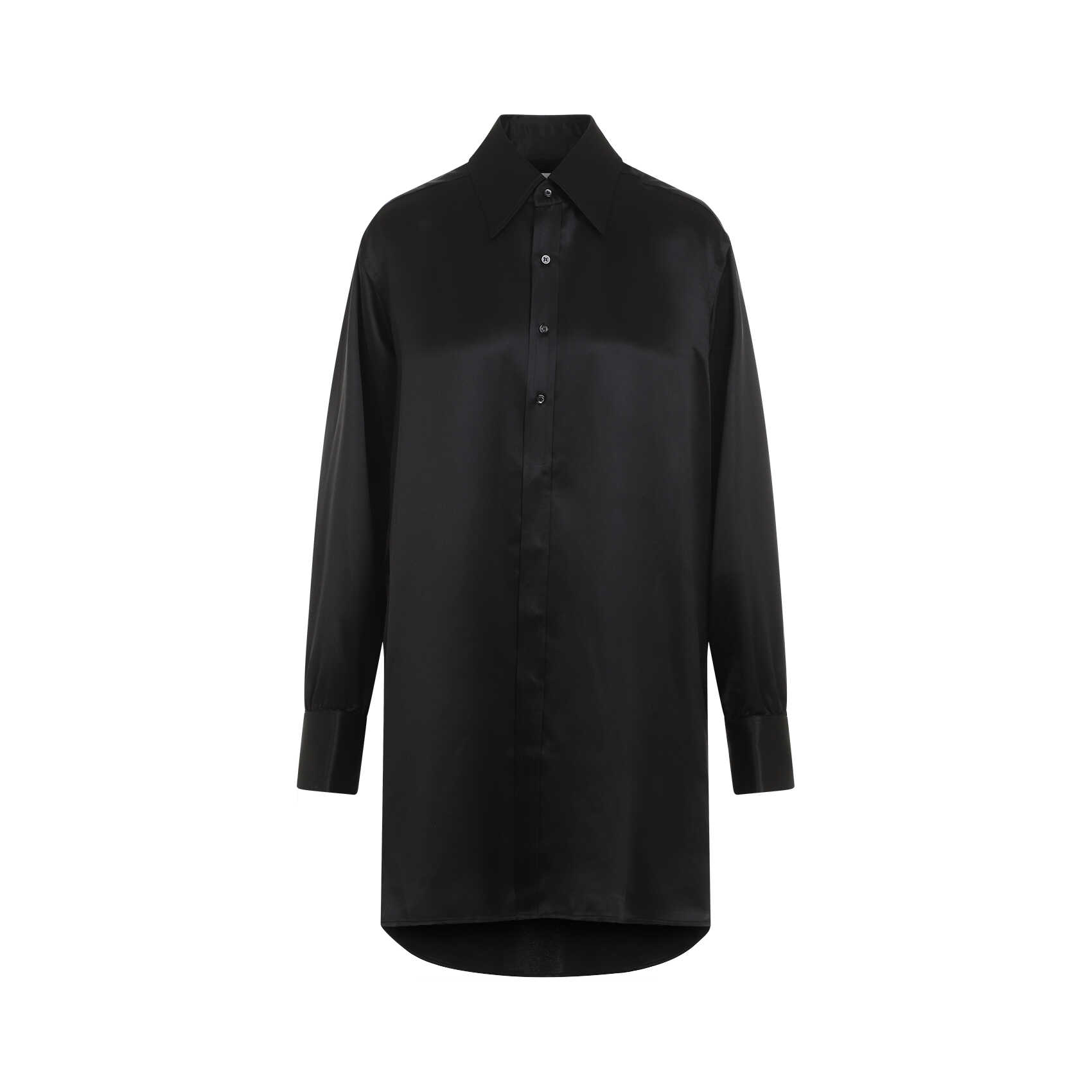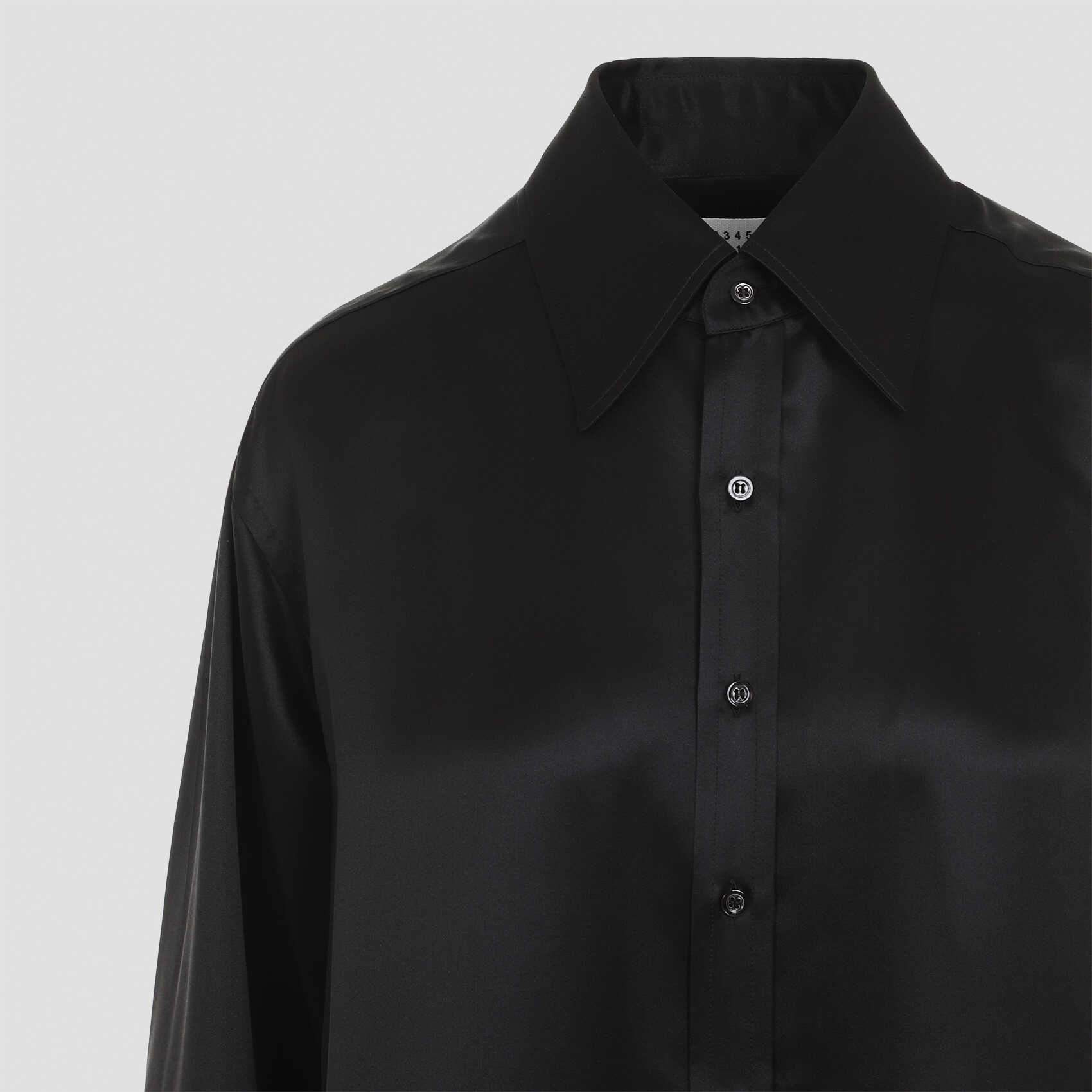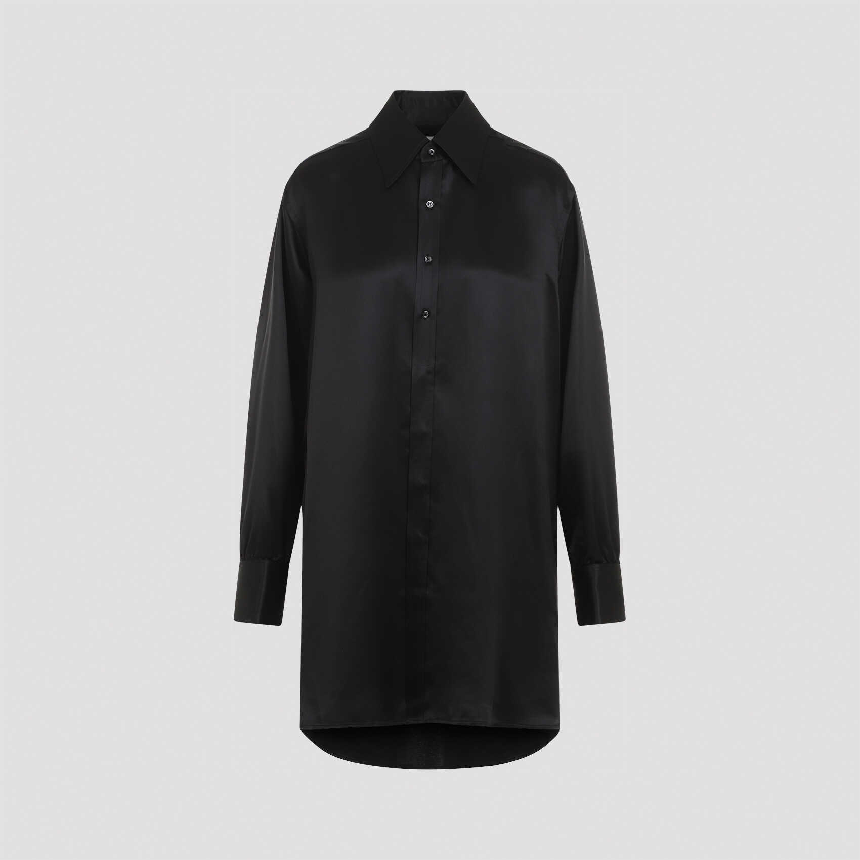 Elevate your style with this luxurious black silk shirt by MAISON MARGIELA. Featuring a pointed collar, front button closure, and signature white stitching at the back yoke. Perfect for adding a touch of sophistication to any outfit. Embrace timeless elegance with this must-have wardrobe staple. Limited availability, shop now!