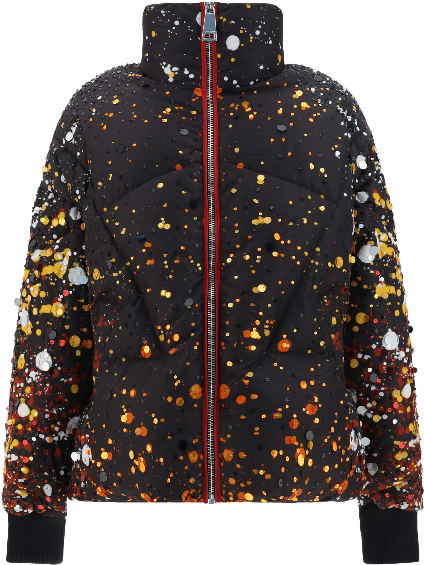 Moon Fireworks Down Jacket by Khrisjoy, high colo, front zipper closure, two side welt pockets, ribbed cuffs, adjustable drawstring hem, all-over multicolored sequin applique, all-over quilted and padded design, regular fit.