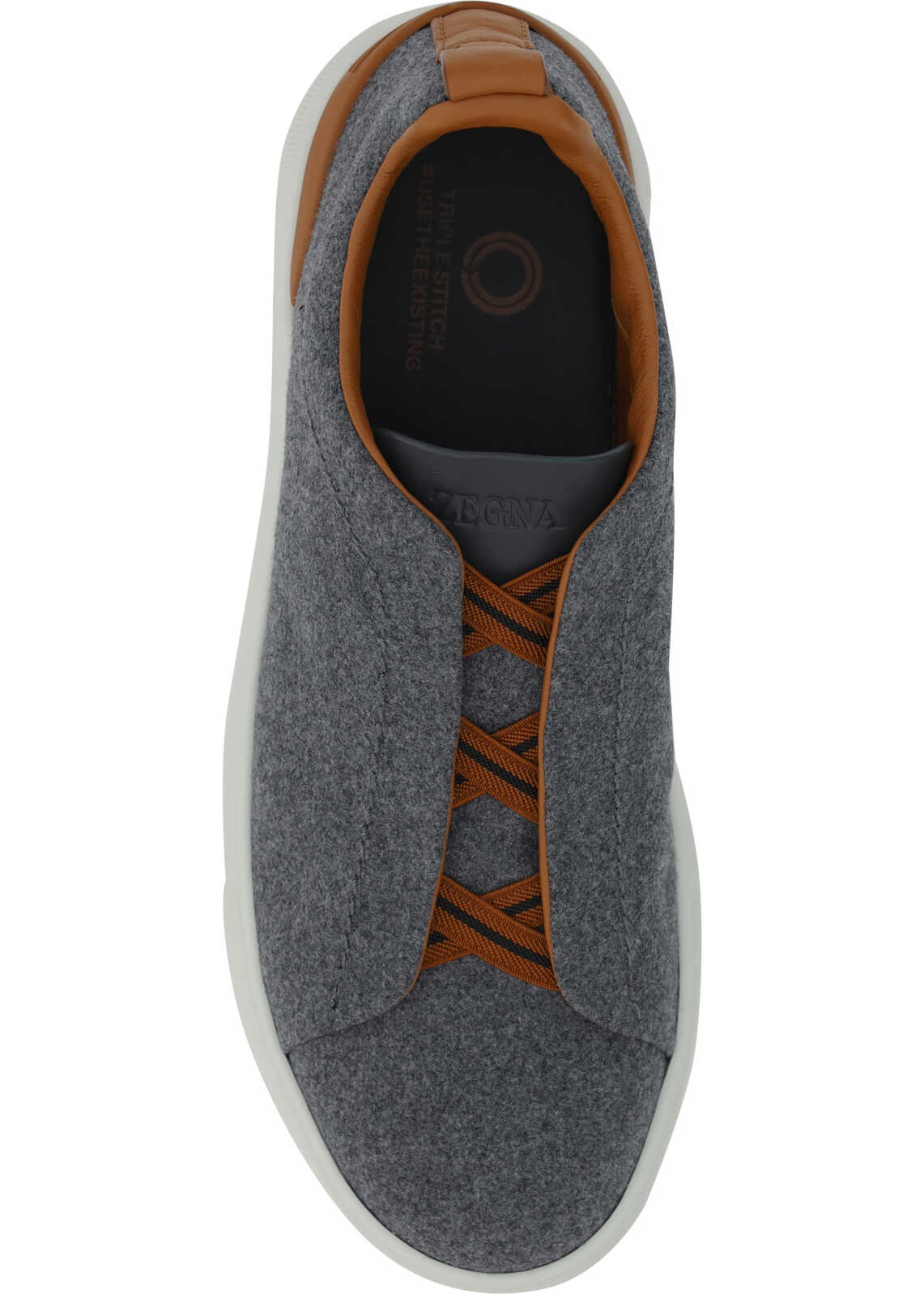 Wool Triple Stitch Sneakers by Zegna, contrasting leather detailing, flat sole, slip-on style, logo-embossed insole.