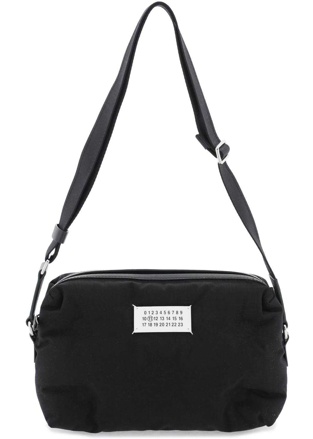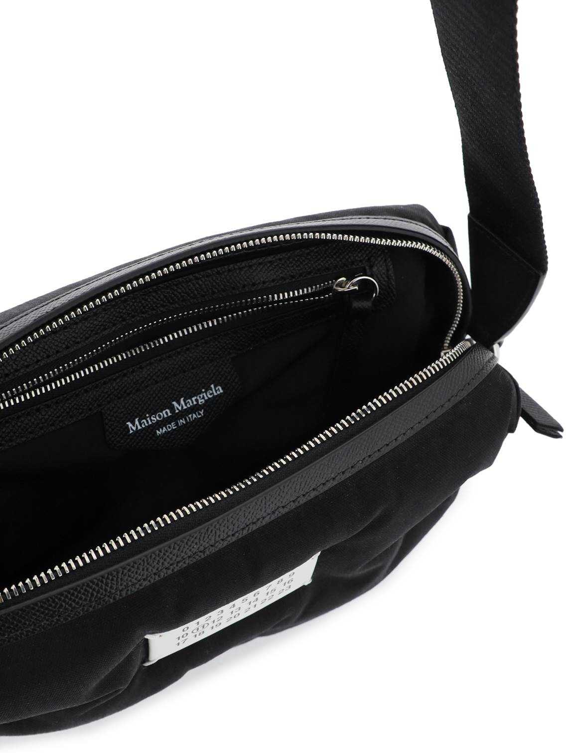 Maison Margiela Glam Slam crossbody bag in quilted and padded nylon witj contrasting grained leather trims. Iconic white leather logo tag applied on front, zip closure, nylon lining and one inner zippered flat pocket. Adjustable and detachable fabric shoulder strap with leather details. Silver-finished metalware.