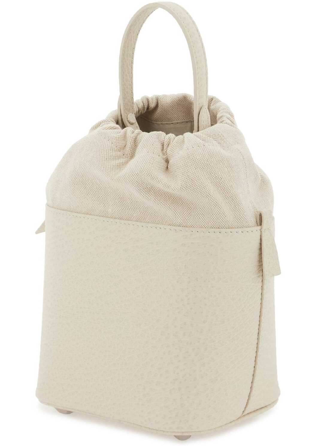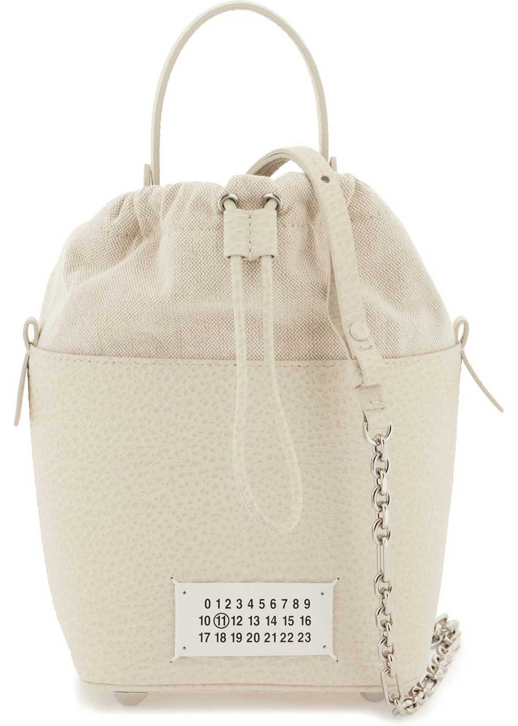 5AC mini bucket bag in hammered leather by Maison Margiela, featuring a squared line with fabric upper insert with drawstring closure. Detachable single handle, removable chain shoulder strap with adjustable leather insert, fabric-lined interior with a small leather patch pocket, protection studs at the base and the iconic white logo label applied on front. Steel-finished metalware.