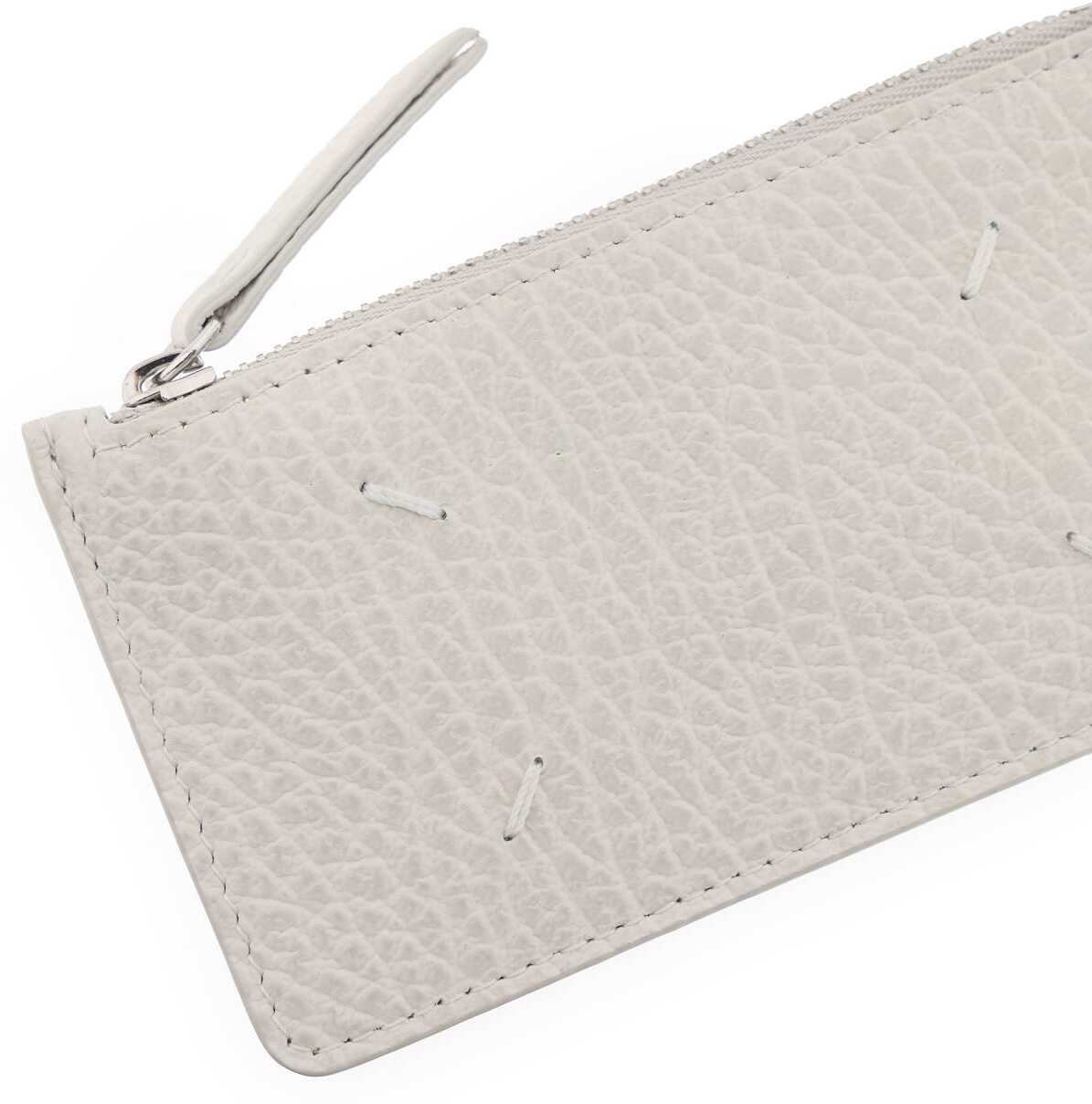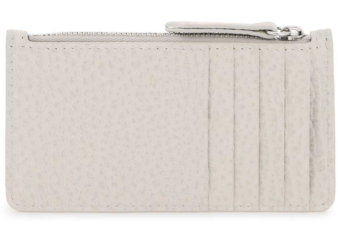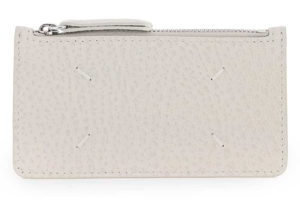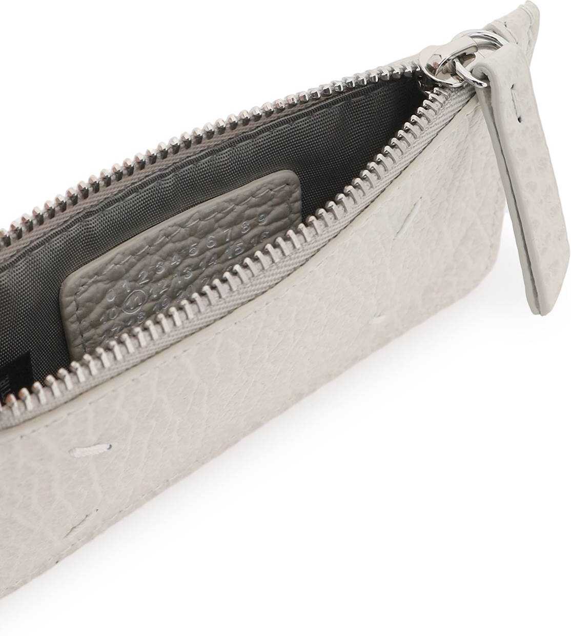 Maison Margiela cardholder crafted in grained leather featuring the iconic four white stitches on front, a middle zipped slit pocket and five credit card slots on the back. Silver-finished metalware.