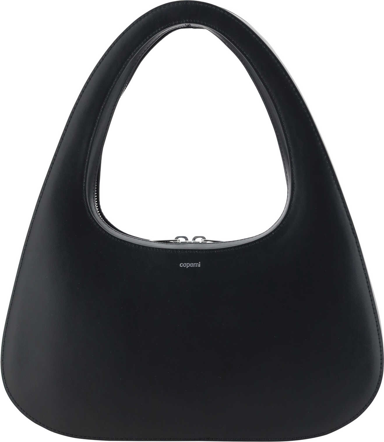 Leather Baguette Swipe Large Shoulder Bag by Coperni, unique design, hobo shape, top closure with double-slider zipper, single interior compartment, iconic three-dimensional brand monogram plaque embossed on contrasting front, removable and adjustable flat shoulder strap, interior welt pocket.