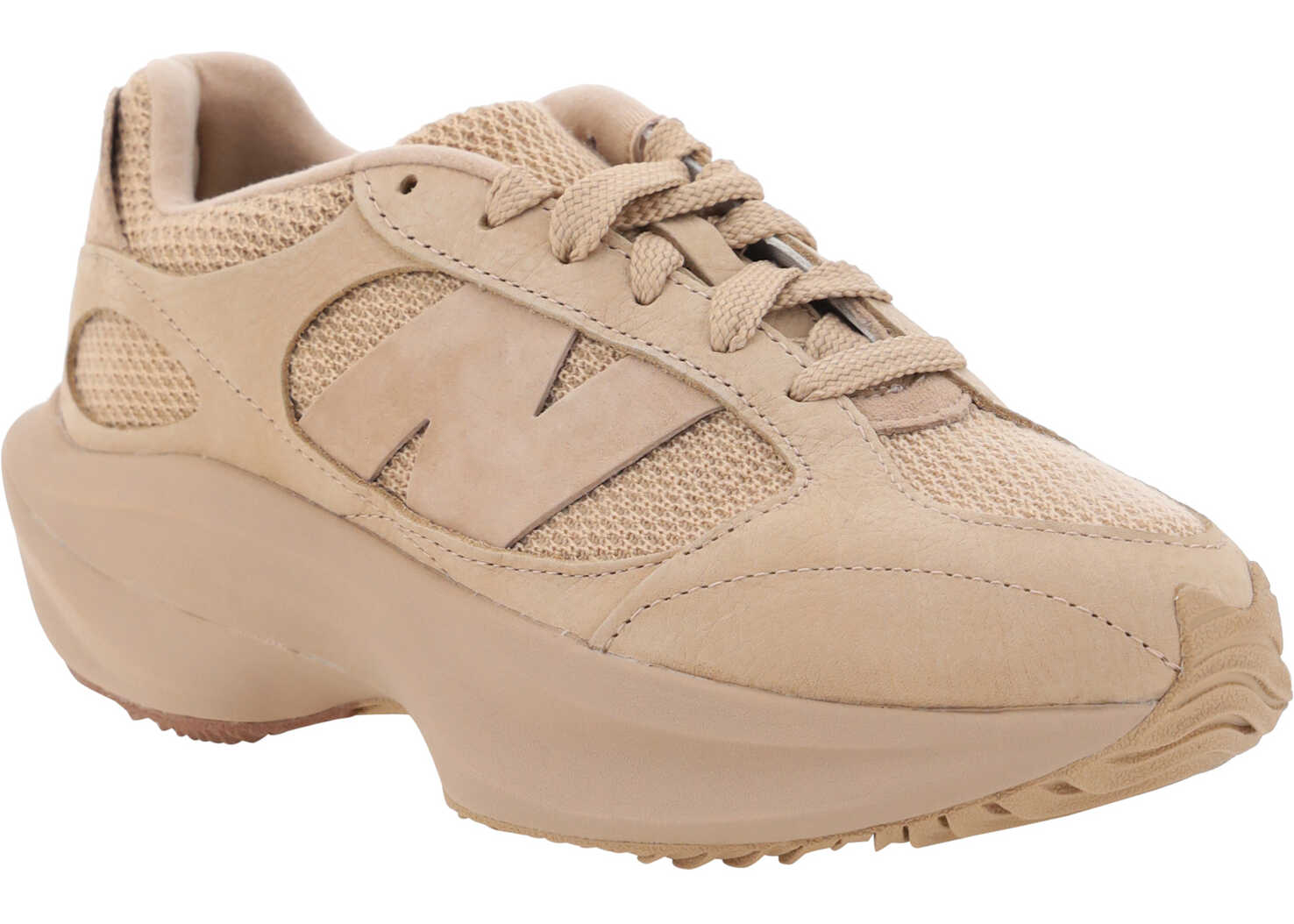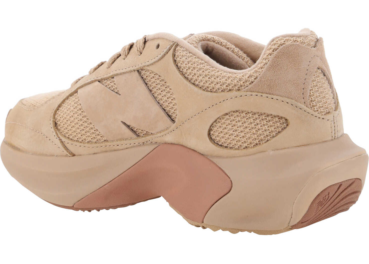Sneakers by New Balance, mesh upper with suede detailing, lace-up front closure, elongated toe on front, raised and reinforced rubber sole, contrasting iconic brand monogram on side panels, contrasting logoed front tab.