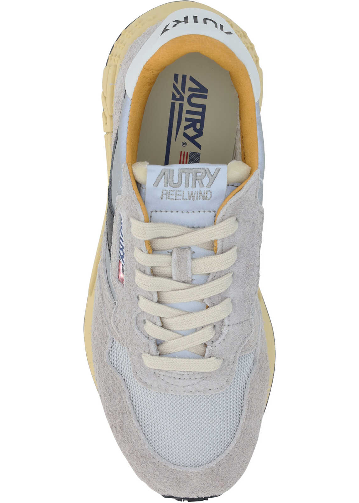Reelwind Low Sneakers by Autry, elongated toe, front lace-up closure, logo-embossed insole, textured platform sole at heel, non-slip knurled sole, contrasting iconic brand monogram on outer side panel.