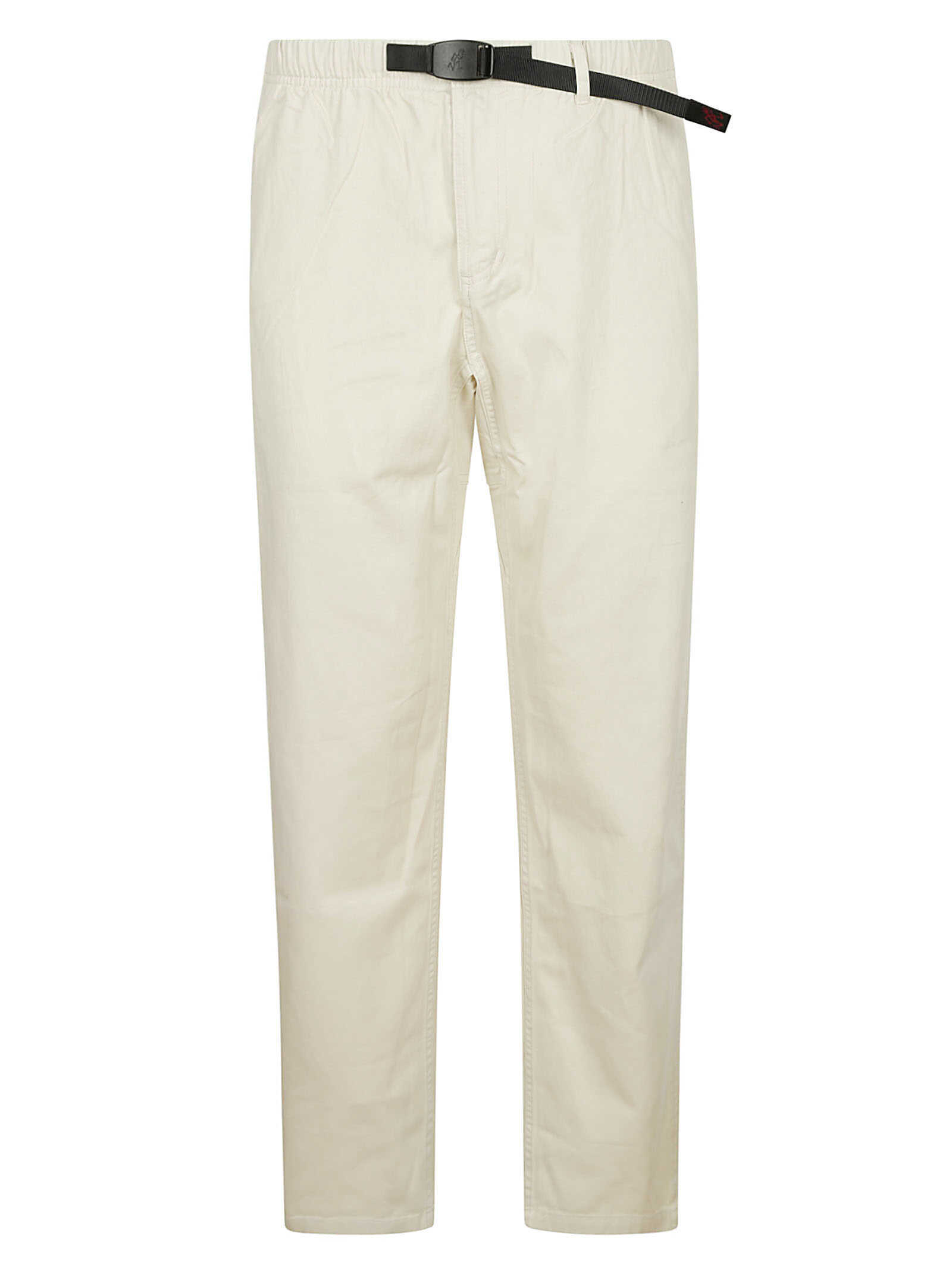 Gramicci Ivory cotton trousers, adjustable drawstring closure, elastic waist, side pockets, back welt pockets, logo detail.