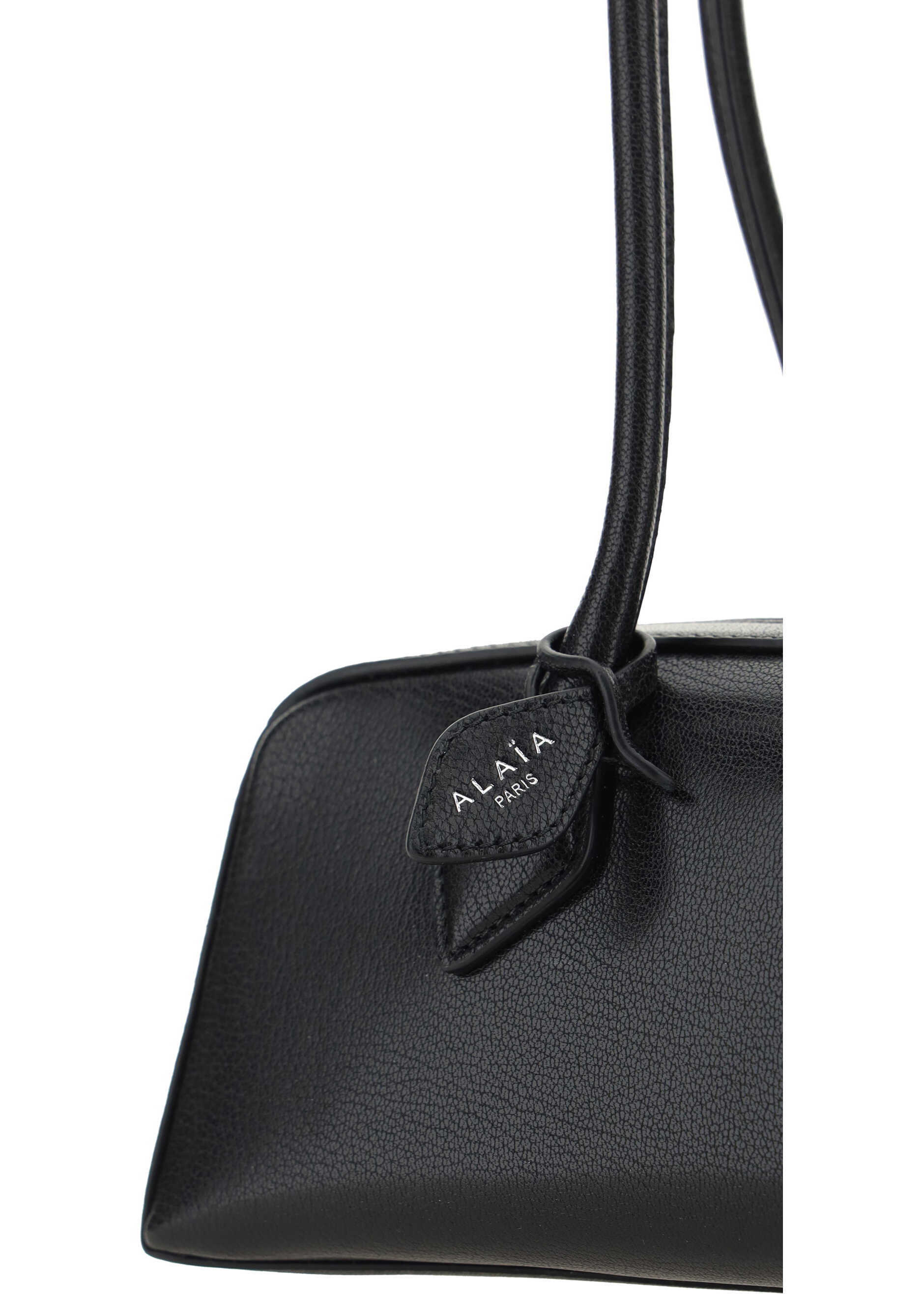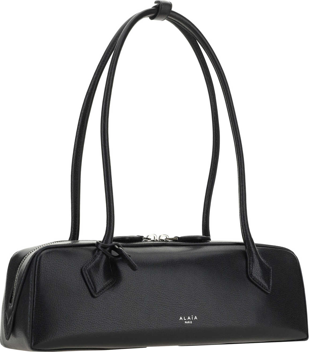 Goatskin Le Teckel Shoulder Bag by Alaïa, featuring a double semicircular stiff top handle, a geometric pattern, a double-slider zipper closure at the top, and a contrasting iconic brand monogram at the front panel.