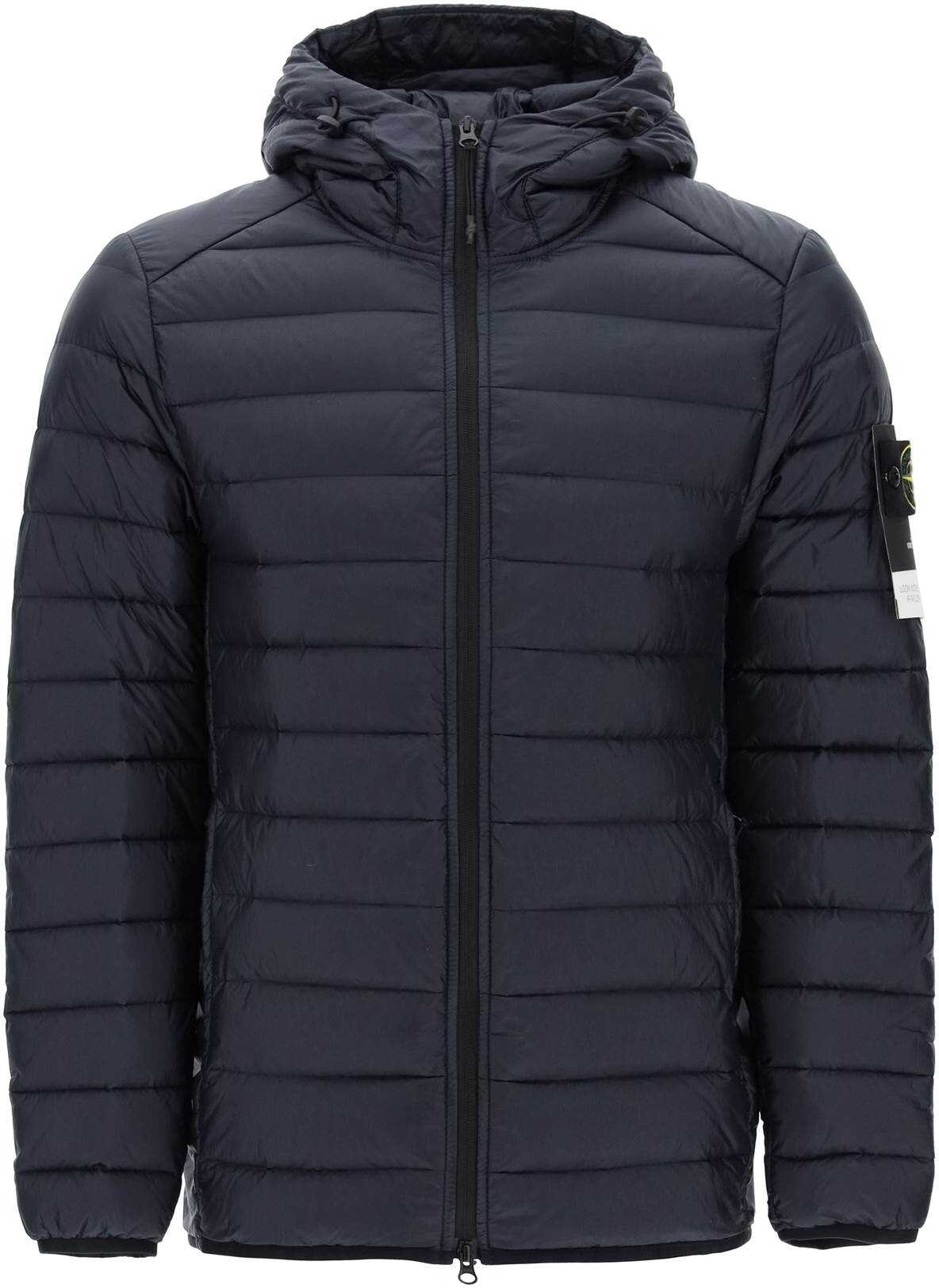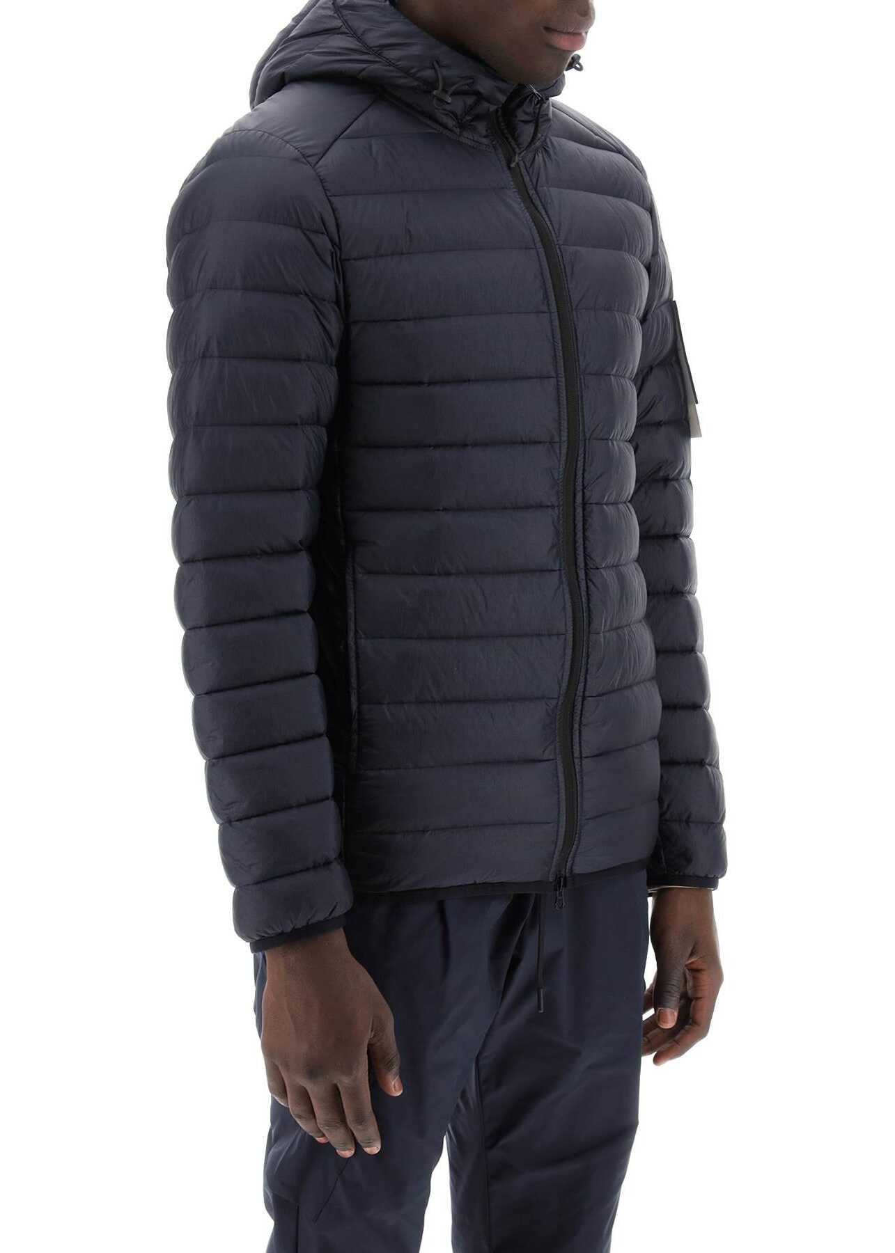 Crafted in garment-dyed recycled nylon with a shiny finish and an anti-drop treatment, this lightweight, seamless-quilted jacket is filled with 90/10 duck down using a direct-injection technique. It is designed with an adjustable hood, a two-way zip closure, and side zip pockets. The signature detachable logo badge appears on the sleeve. Regular fit. The model is 187 cm tall and wears size L.