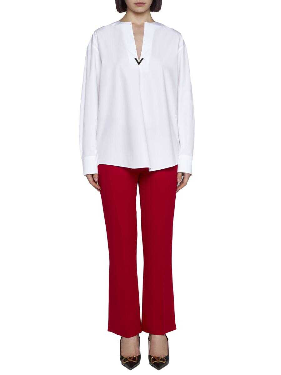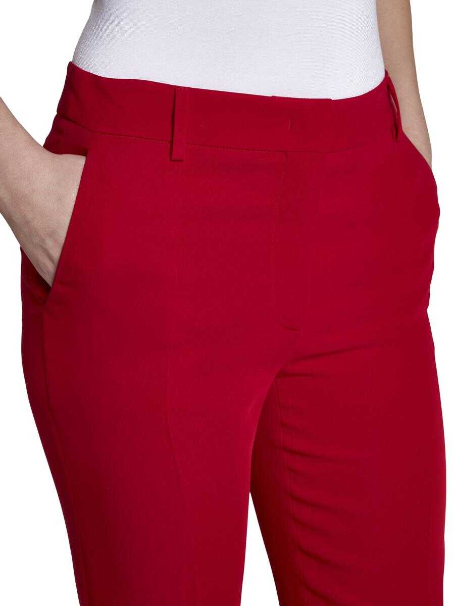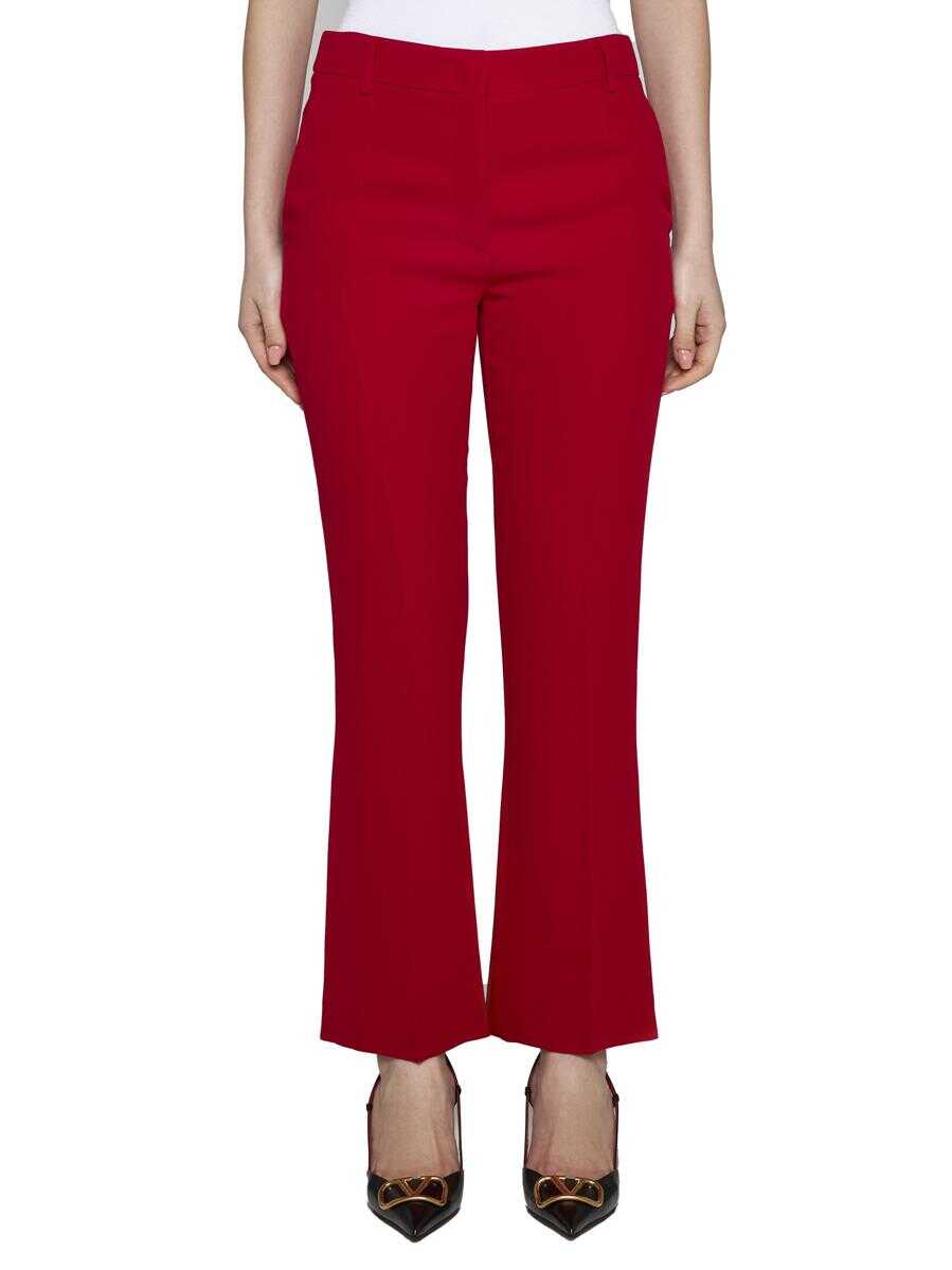 Valentino’s red silk trousers featuring belt loops, concealed hook and zip fastening, side pockets, rear welt pockets and flared leg with ironed crease.The model is wearing accessories and shoes from Valentino Garavani.