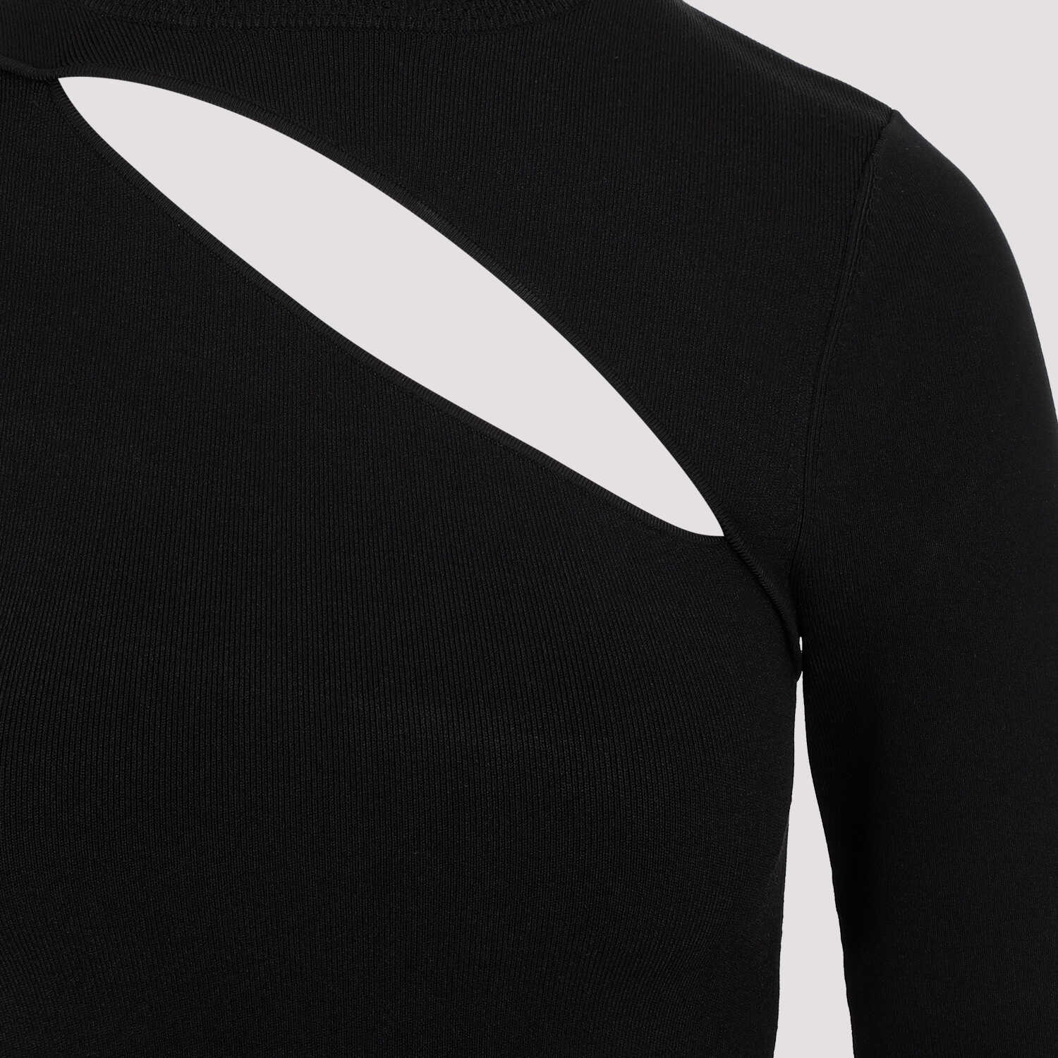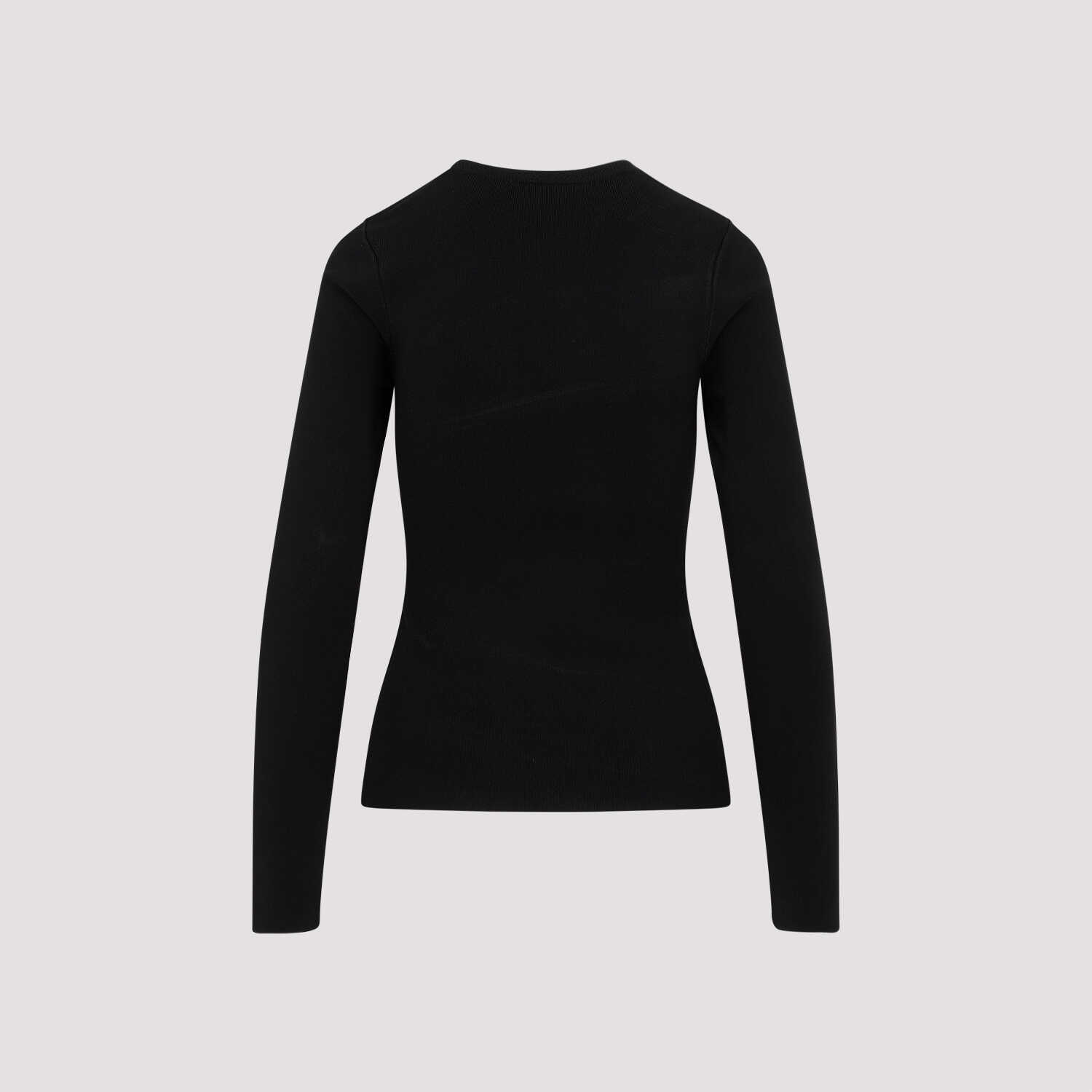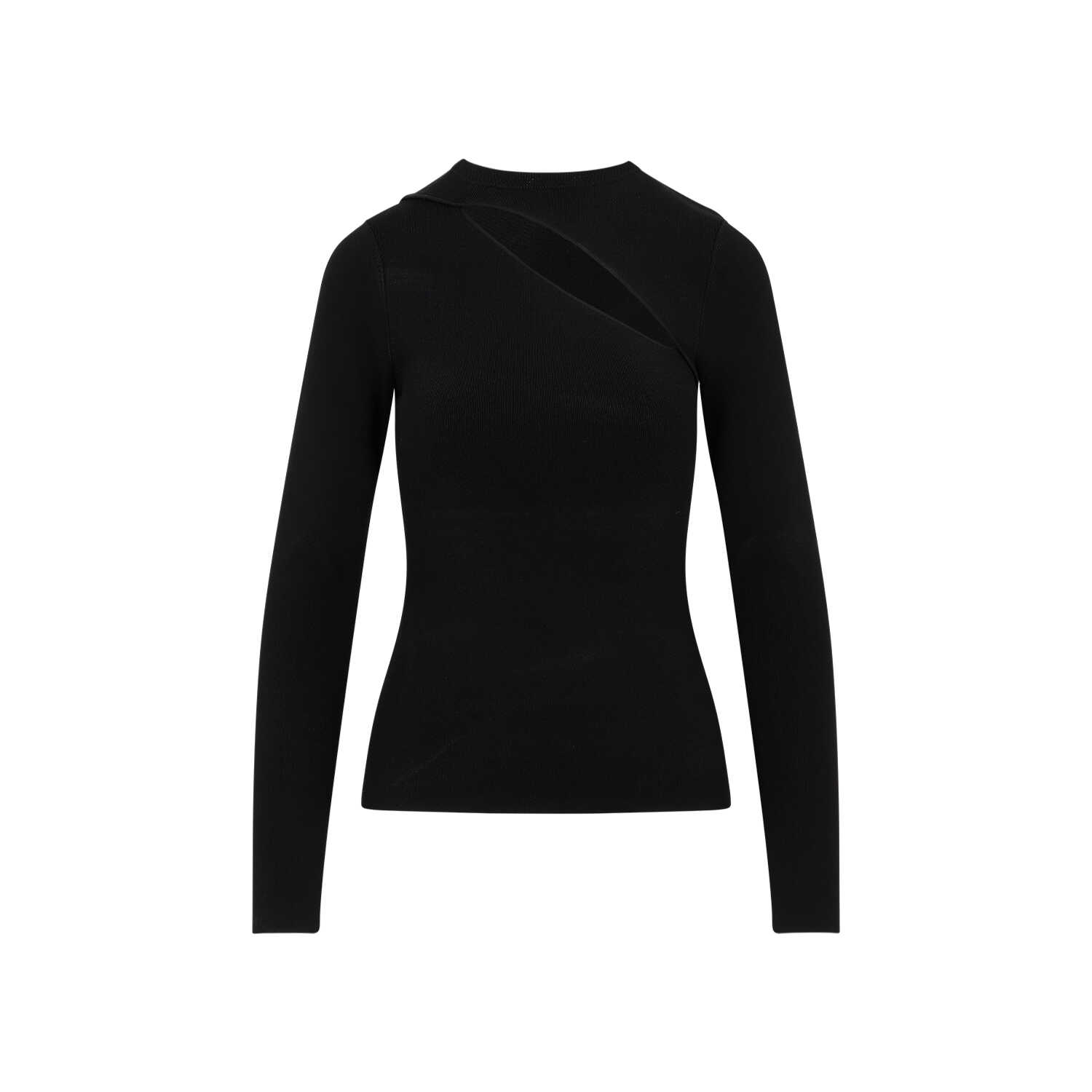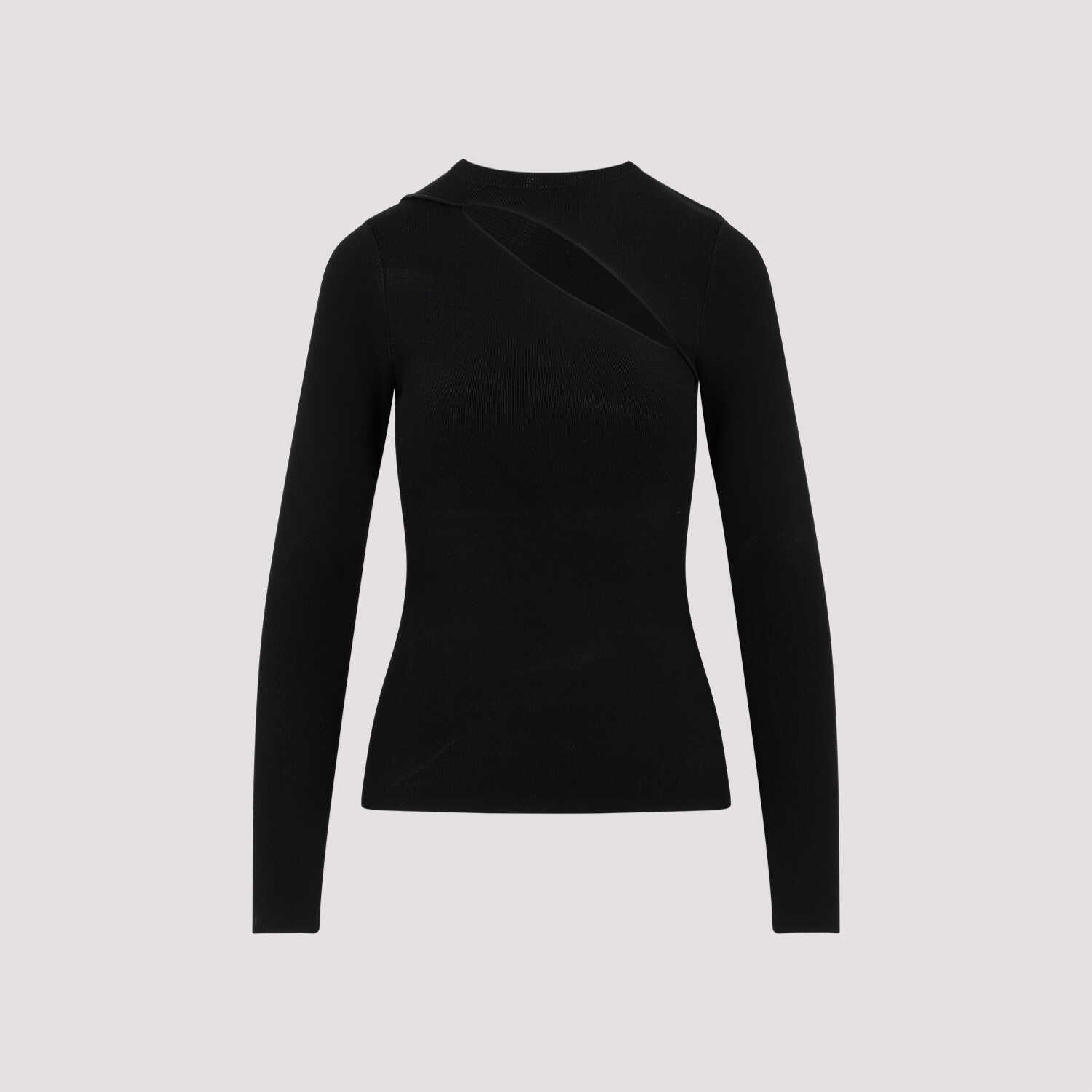 Victoria Beckham Black Asymmetric Cut-Out Top. Crafted in a black viscose and tech fabrics blend. Crewneck, long sleeves, front asymmetric cut-out detail, straight hem.