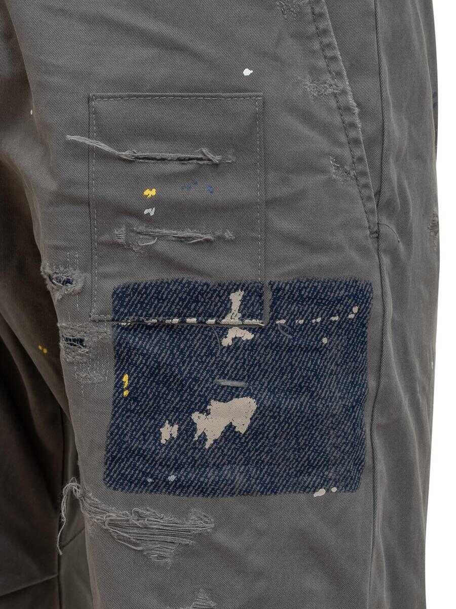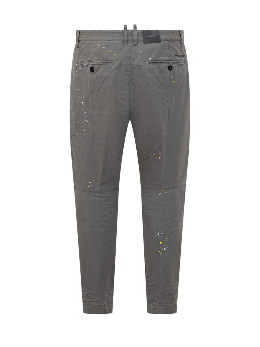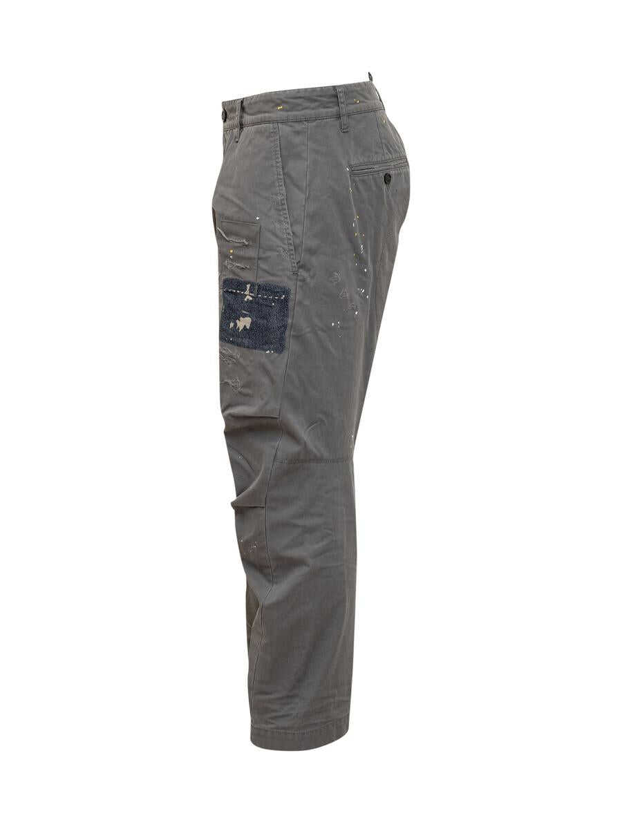 Cotton pants. Button closure. Belt loops. Two slanted side pockets. Two welt pockets with button on back. Ruined effect on the front. All over color splatter decoration.