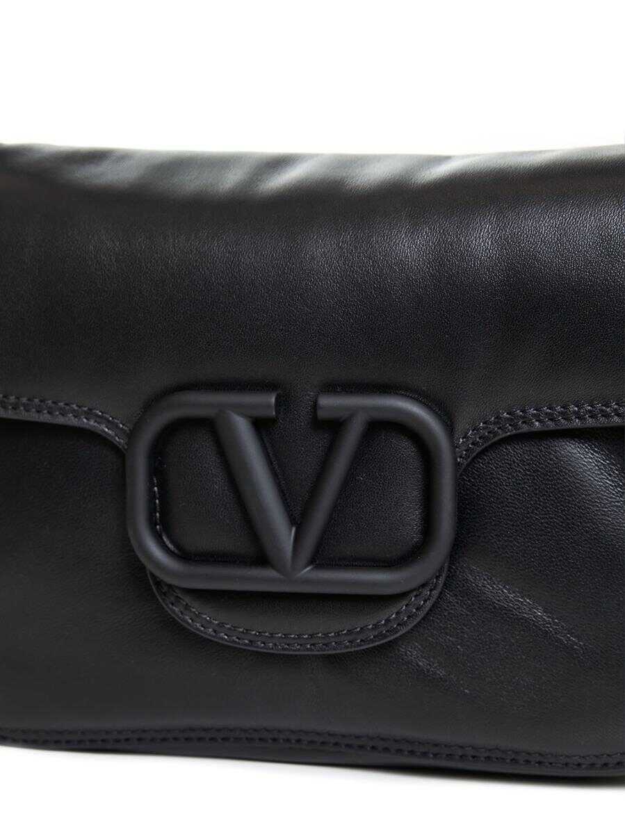 Valentino Garavani’s Noir black nappa leather shoulder bag featuring an adjustable and detachable top handle, adjustable and detachable fabric shoulder strap, tone-on-tone rubberized metal VLogo Signature buckle, concealed magnetic fastening, back flat pocket, internal zip pocket and silver-tone metal hardware.