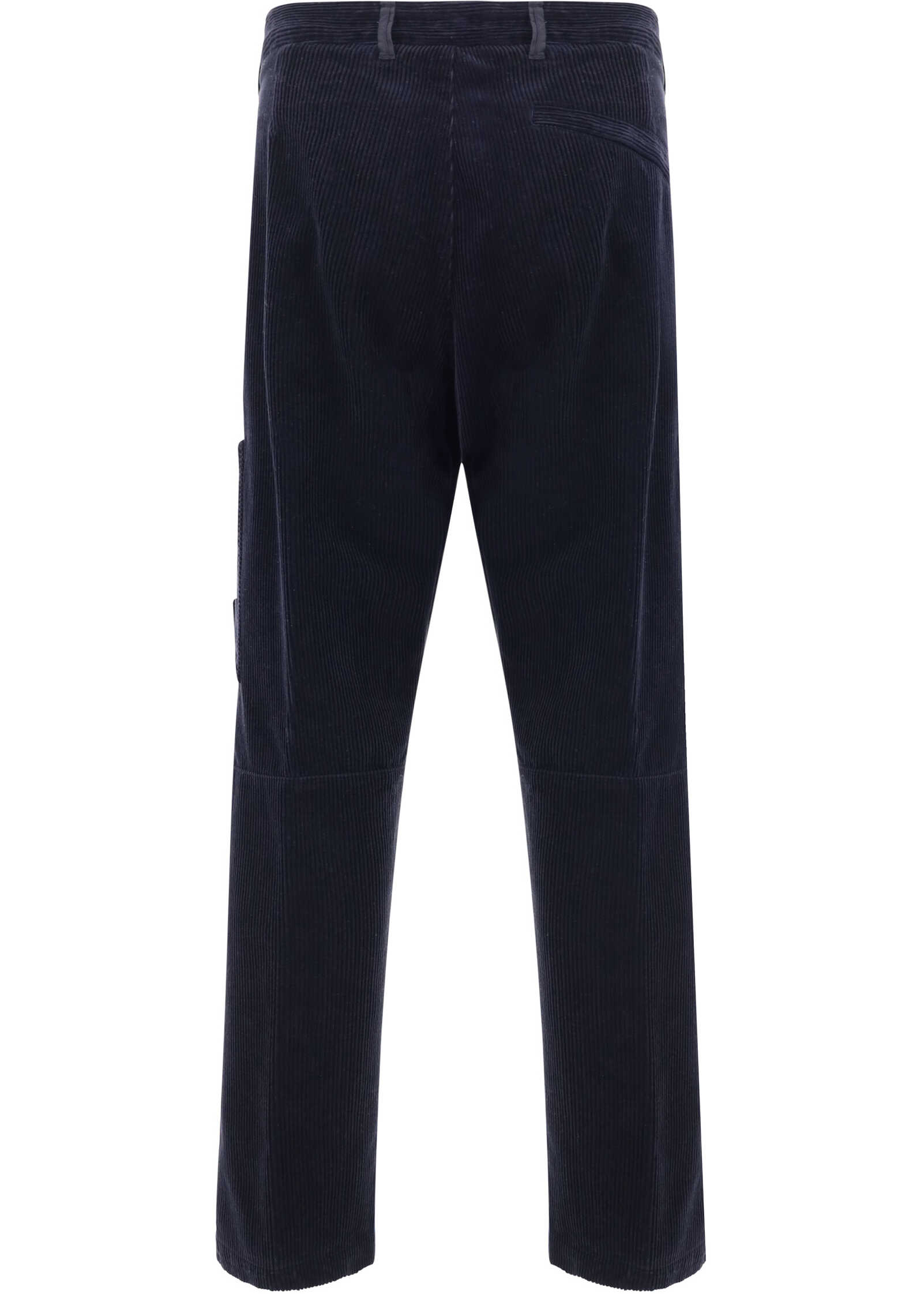 Cotton Pants by Stone Island featuring a corduroy design, a five-pocket style, a front zipper and button closure, a side patch pocket, the brand's iconic contrasting applied logo on the side, a monochrome pattern, and a regular fit.
