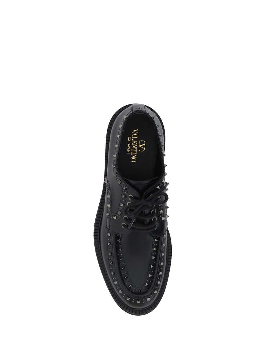 Valentino Garavani’s Rockstud black leather derby shoes featuring iconic silver-tone metal studs along the edges, rounded toe, thin laces and rubber sole with low heel.