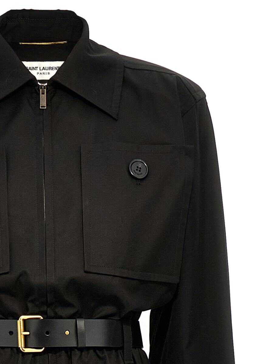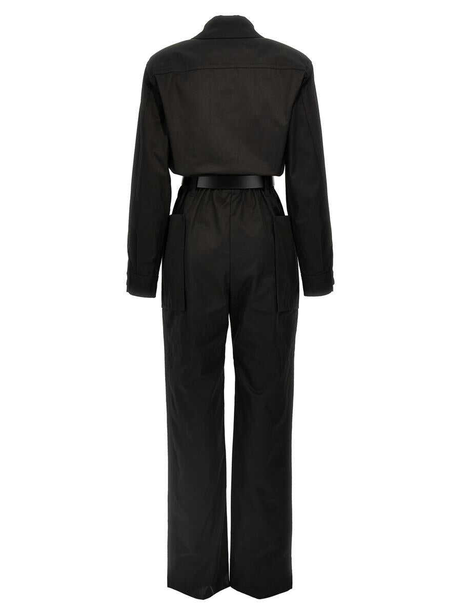 Cotton twill one-piece jumpsuit with front zip closure, pockets, leather belt at the waist, long cuffed sleeves